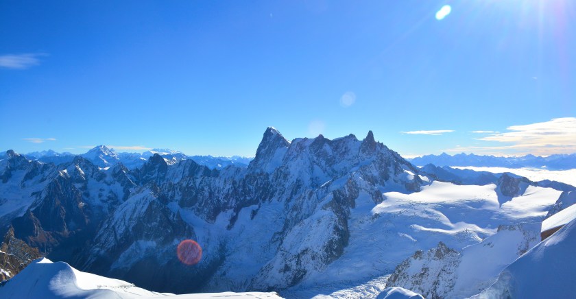 Next morning we were ready to go to the highlight of our entire trip, the Cable car ( technically cars as we have to change cars at midpoint) up the Aiguille du Midi. We got the tickets quickly and queued up ( very short one) for the first cable car up. Most of the people in the cable car were mountaineers who were going up Mont Blanc from the station on top. The ride up is a quick one and we gained altitude very quickly. The cable car swings like a pendulum when it reaches a support tower, enough for some people in the cable car to start screaming. We didn’t waste time at the first stop and straight away ascended to the top in the second cable car. We have been up cable cars before but this is just a beast of a cable car. On top the station has various viewing galleries at different levels giving a 360 degrees view of the Alps. To see the icy peaks ( Mont Blanc and company) and the glacier ( Mer de Glace – Sea of Ice) from such close quarters is a thrilling experience. There are no words adequate to describe the sheer beauty of the view from top so I am just going to post photos.