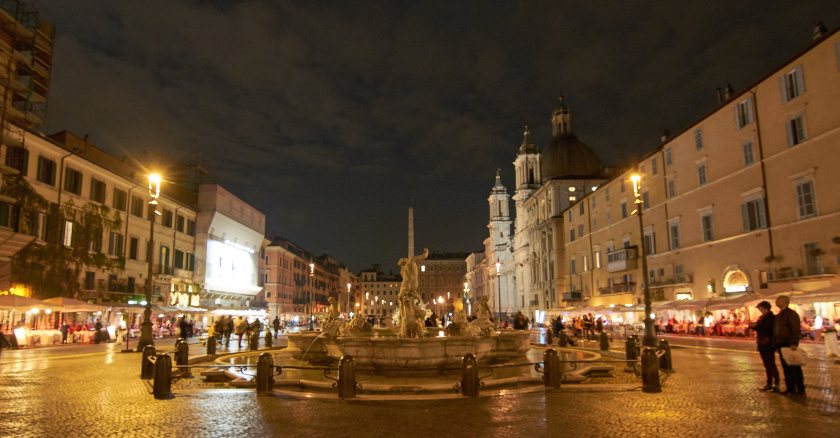 After we left the Pantheon we went on to see the Roman Forum and the Colosseum on our first full day. We returned to the area after sunset to visit the famous squares of the region in all their floodlit wonder. The first square we visited was a rectangular square called the Campo dè Fiori which is lined by cheap cafes, has a statue of Giardano Bruno in the centre (A Philosopher burnt at the spot for heresy!!) and filled with street vendors trying to sell their wares. But it looks splendid lit up all the same!