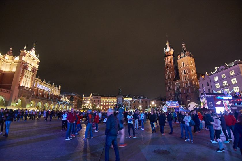 Old town Krakow all lit up with the barricades of the marathon in place