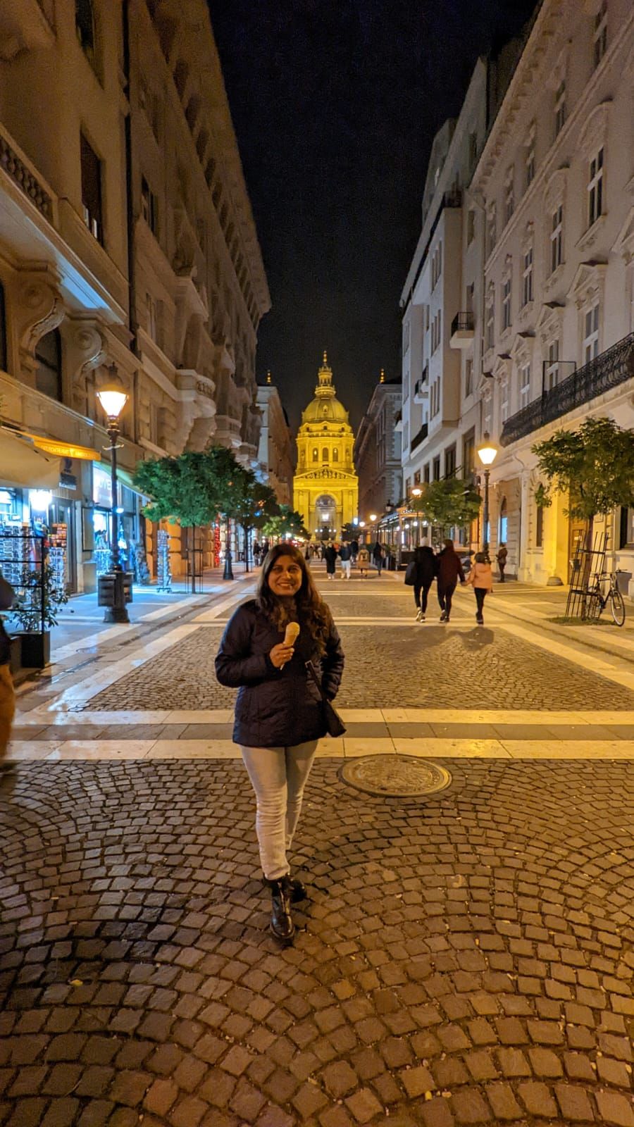 We found a good looking gelato place on Zrinyi Utica leading from the Basilica to the river. We never say no to a gelato and bought ourselves a cone and enjoyed the gelato with a view back to the lit up Basilica.