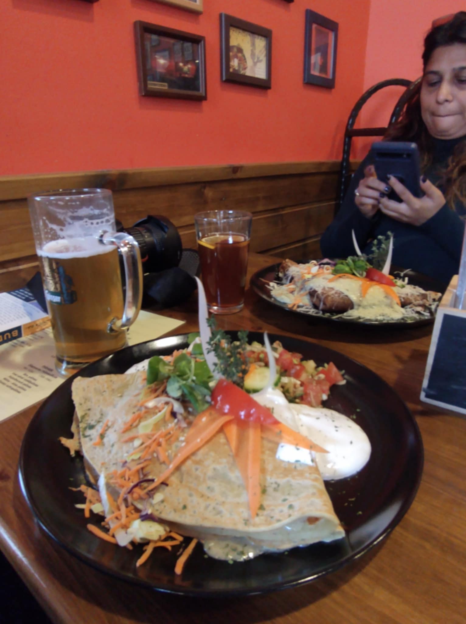 We had no idea how huge these crepes would be and ended up ordering two savoury crepes – one vegetarian for the better half and one with meat for myself and a dessert crepe too. We also ordered a beer for myself and an ice tea for the better half. When the huge servings of savoury crepes arrived we realised that we had made a mistake and ordered too much. Never one to waste food we finished off the delicious but extremely heavy crepes with great difficulty!