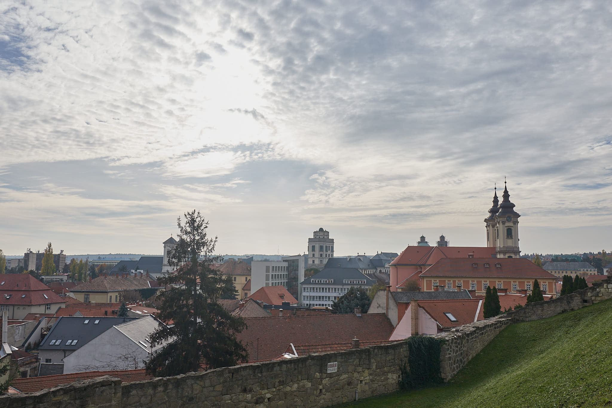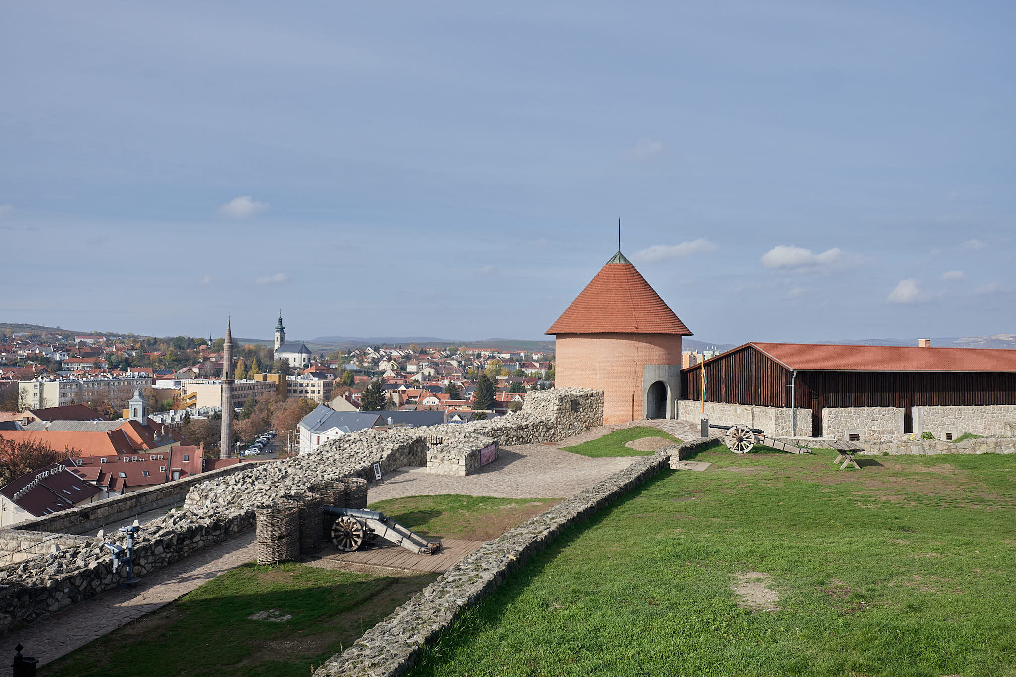 A view of the minaret and the red roofs of old town with modern Eger beyond
