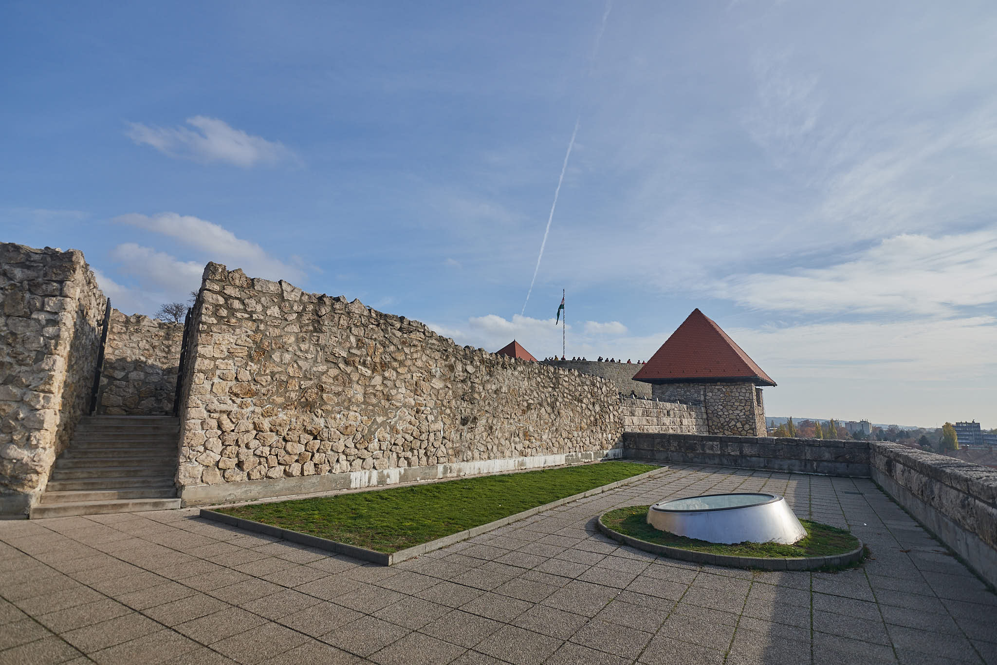 The restored castle walls with the Hungarian flag flying high