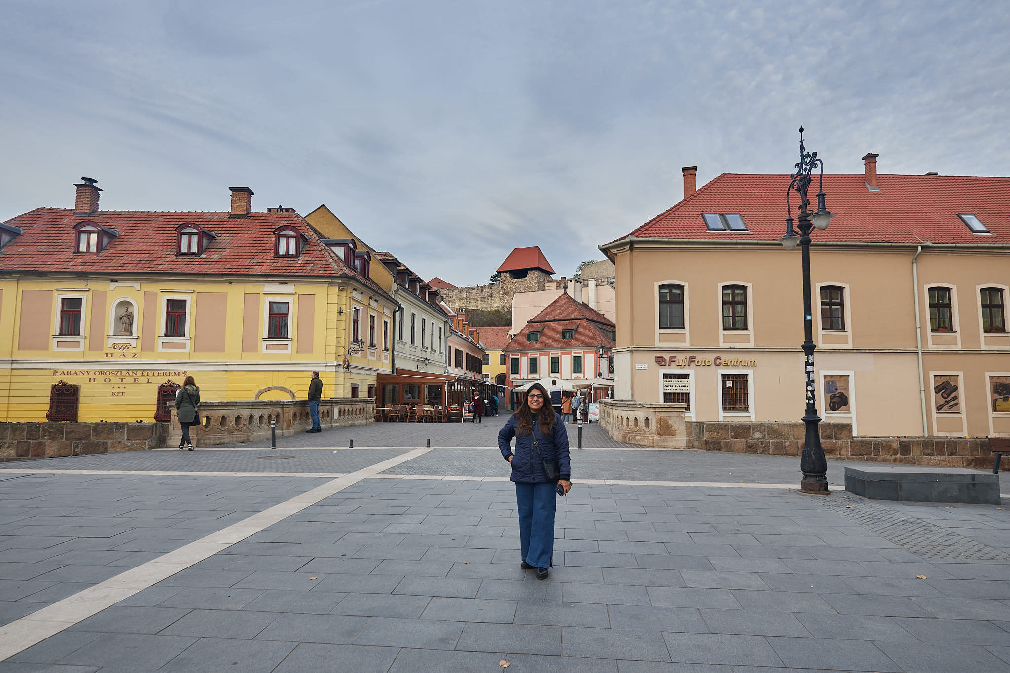 At Dobo square with the small bridge across the creek behind and Eger Castle on the hill above