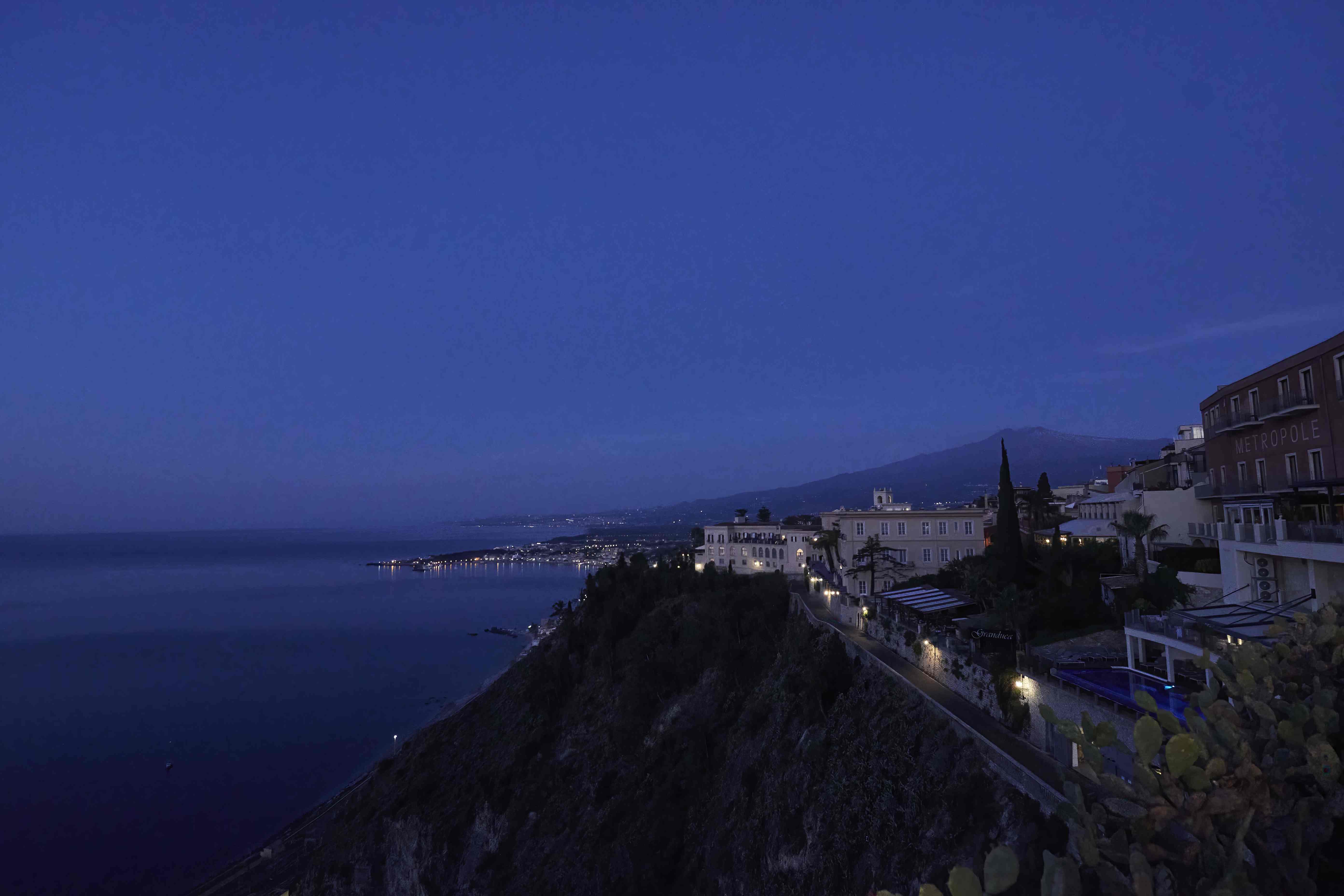 Lights twinkle along the coastline with Mt Etna always looming in the background