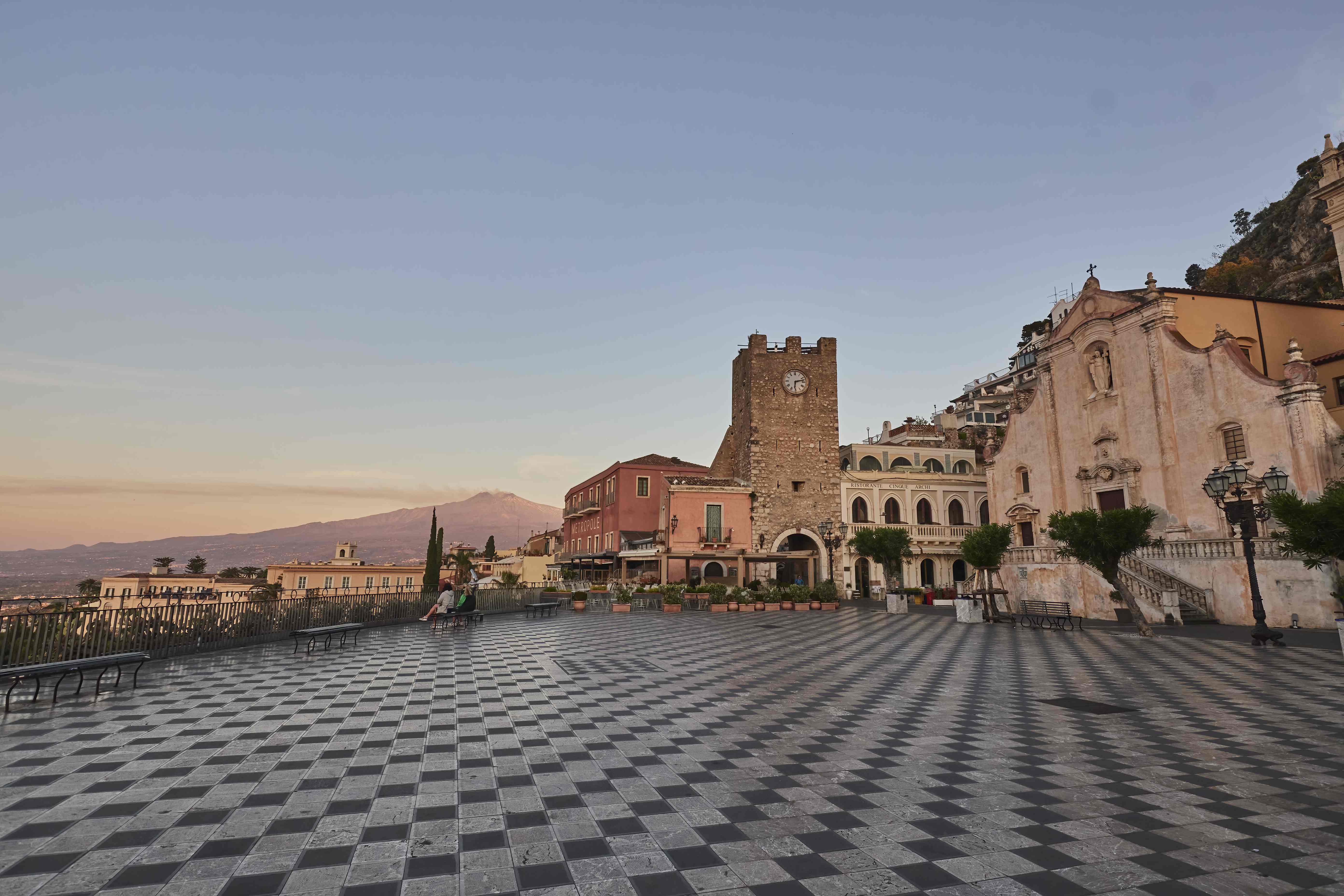 Streets go vertically up from Piazza IX Aprile with the Saracen Castle high above