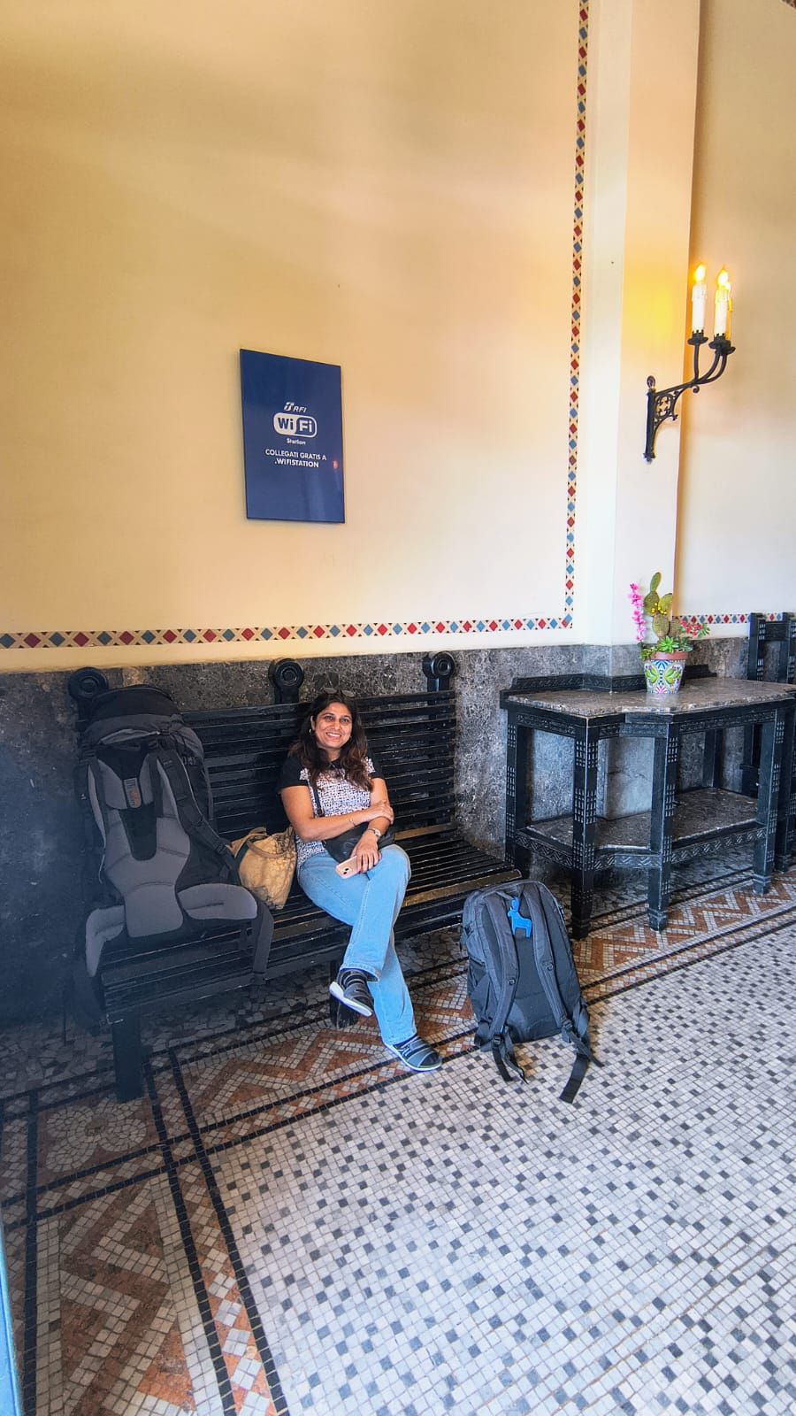 The better half with the entirety of our luggage in the waiting room at Taormina Giardini Station