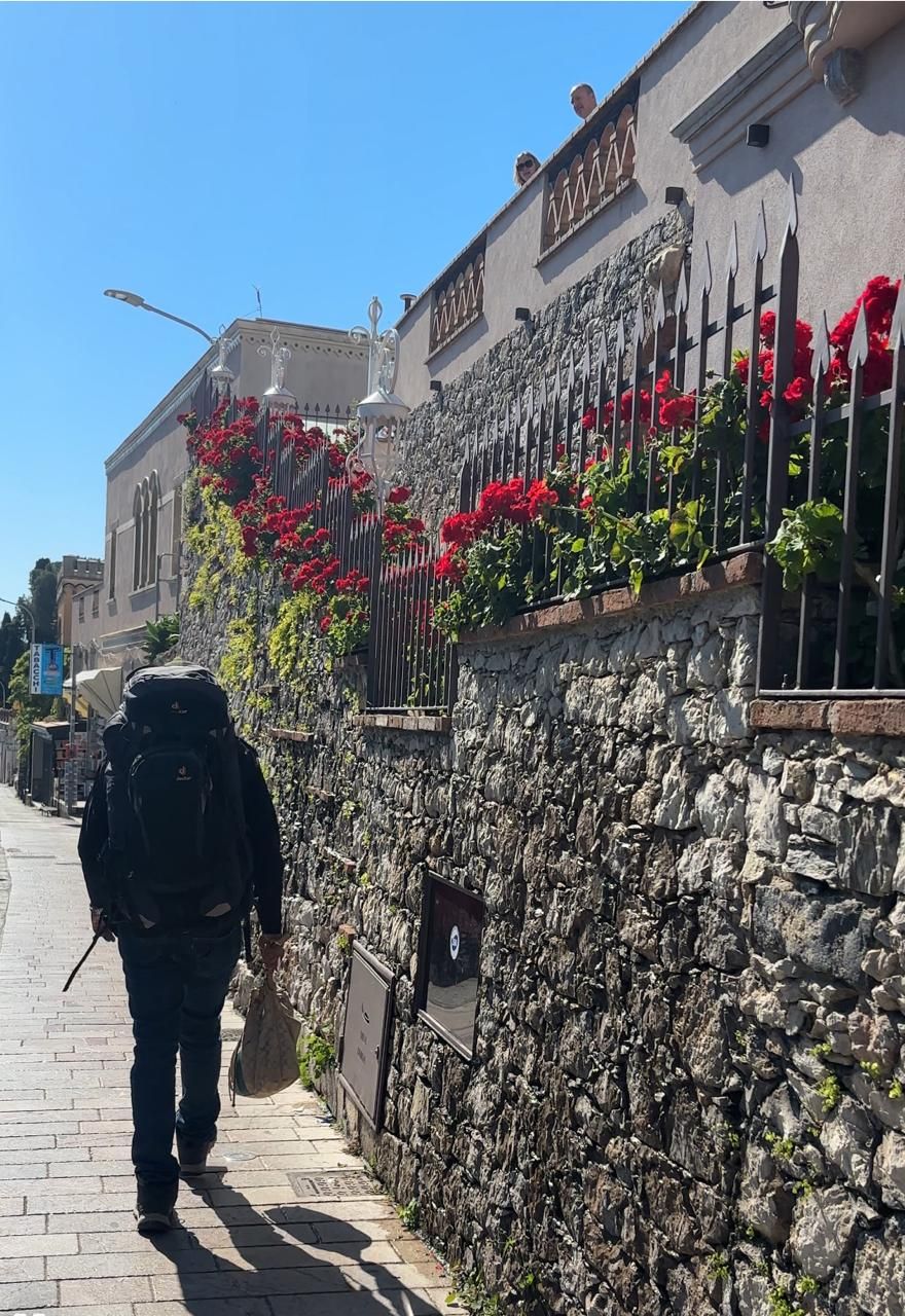Walking to the bus terminal at Taormina with our luggage