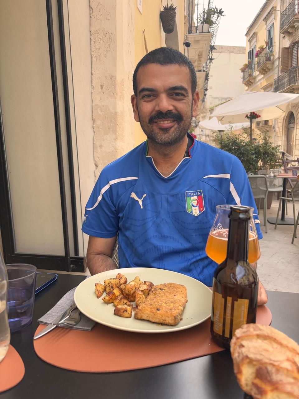 We went to a restaurant called Oz Ortigia right down the lane from our B & B and sat down and had the first of our tasty meals in Ortigia. The better half had a plate of Pasta Ala Norma while I had a Swordfish steak with baked potatoes. I also had a great locally brewed beer which the waiter recommended.