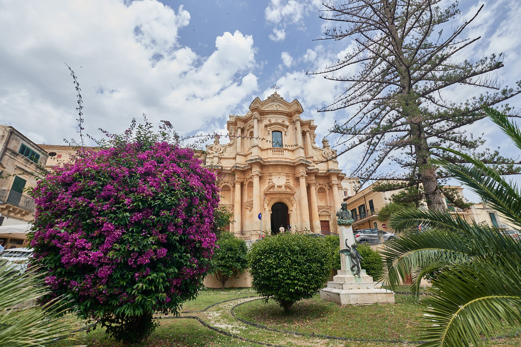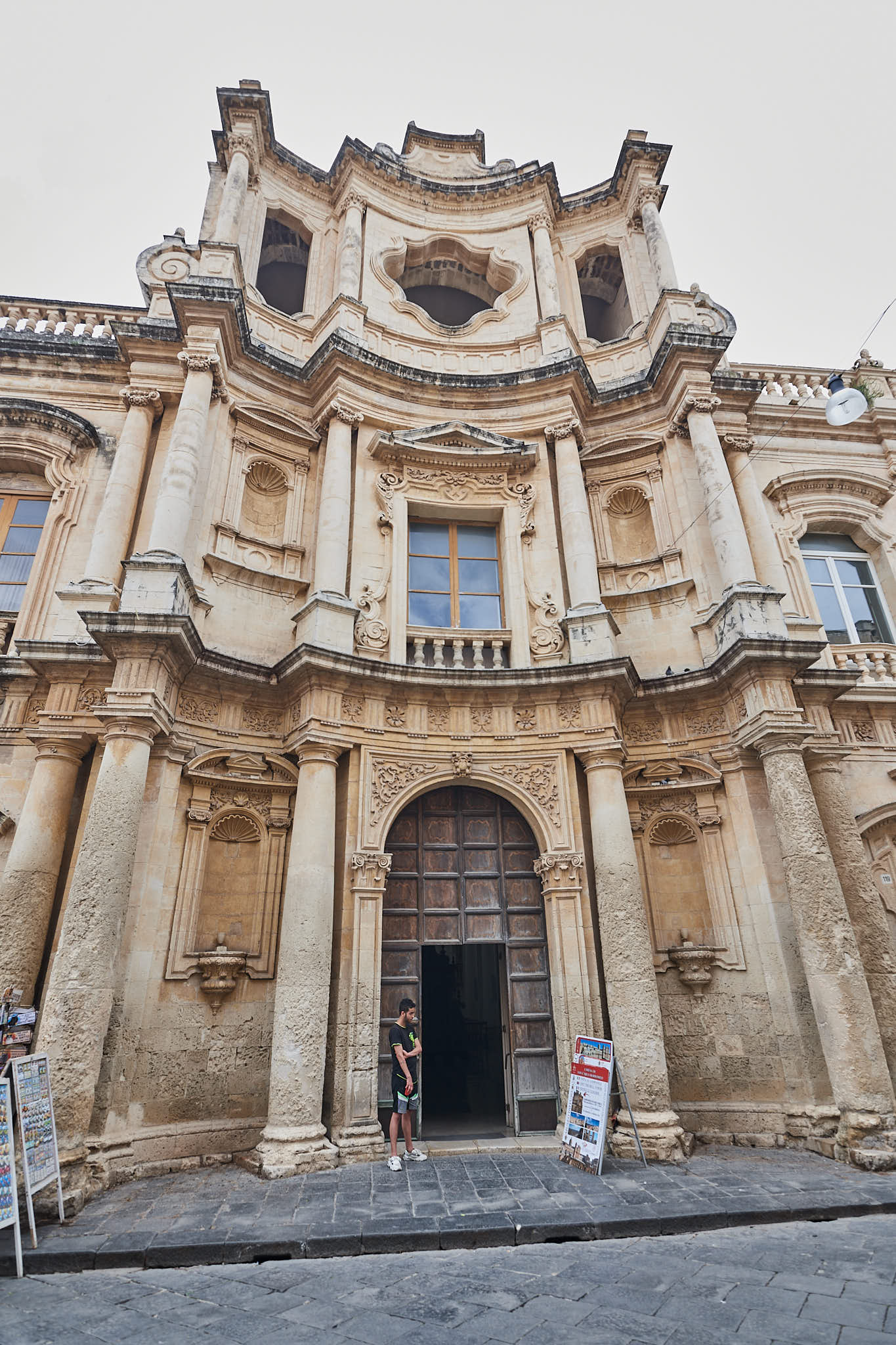After we had our fill of the view we went back down the steep steps without incident and emerged back out on Corso Vittorio Emmanuele. We saw a church at the end of the lane directly opposite the Church of San Carlo. Never averse to going to another church we walked the lane noticing the beautifully decorated balconies, making a note to myself to get the 300mm here the next morning to get some close ups of the same. We learnt later that this was the Corrado Nicolaci lane that is transformed into a floral tapestry each year in the third weekend of May. We were too early for that but the lane was still a pretty one.