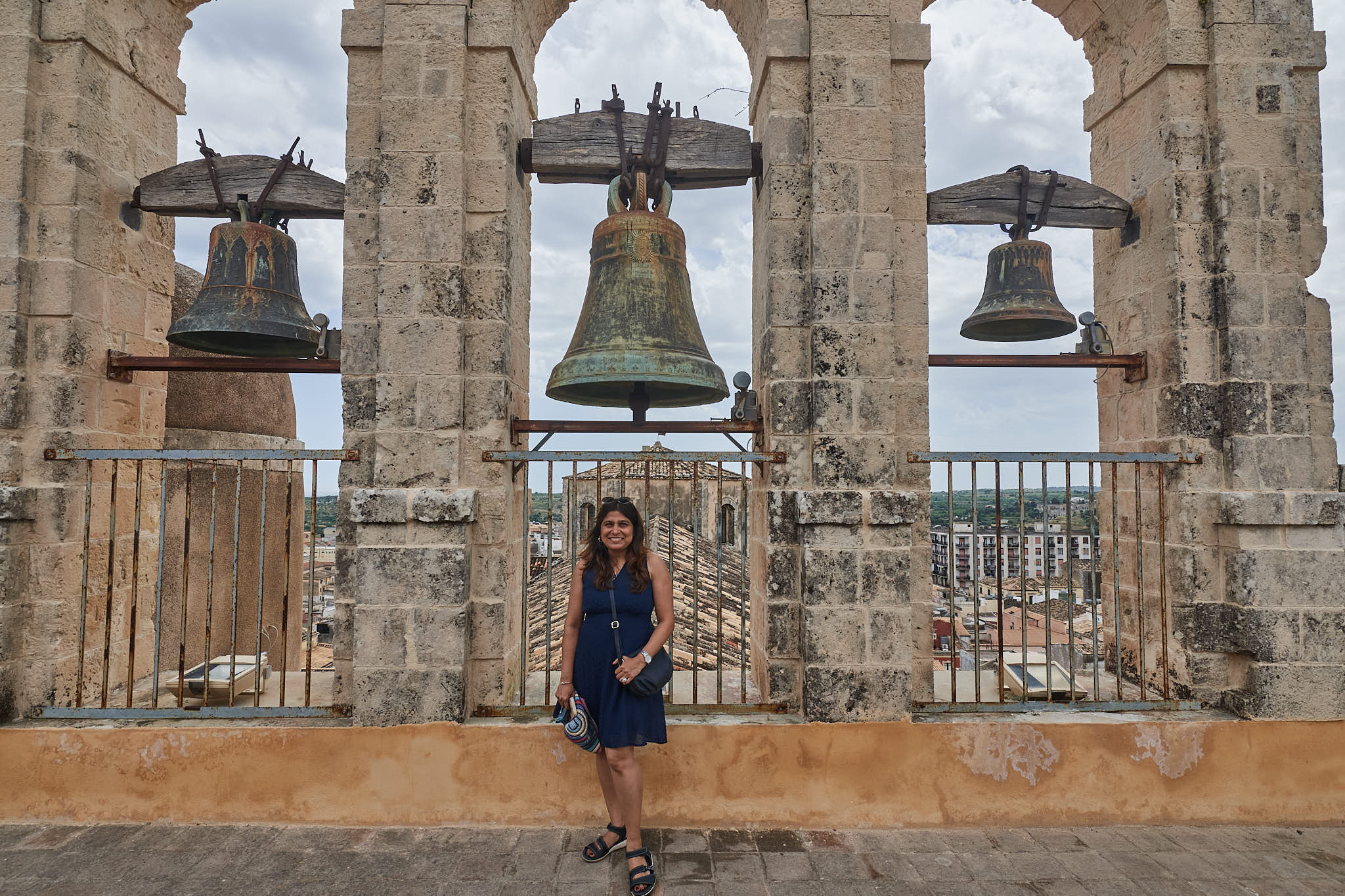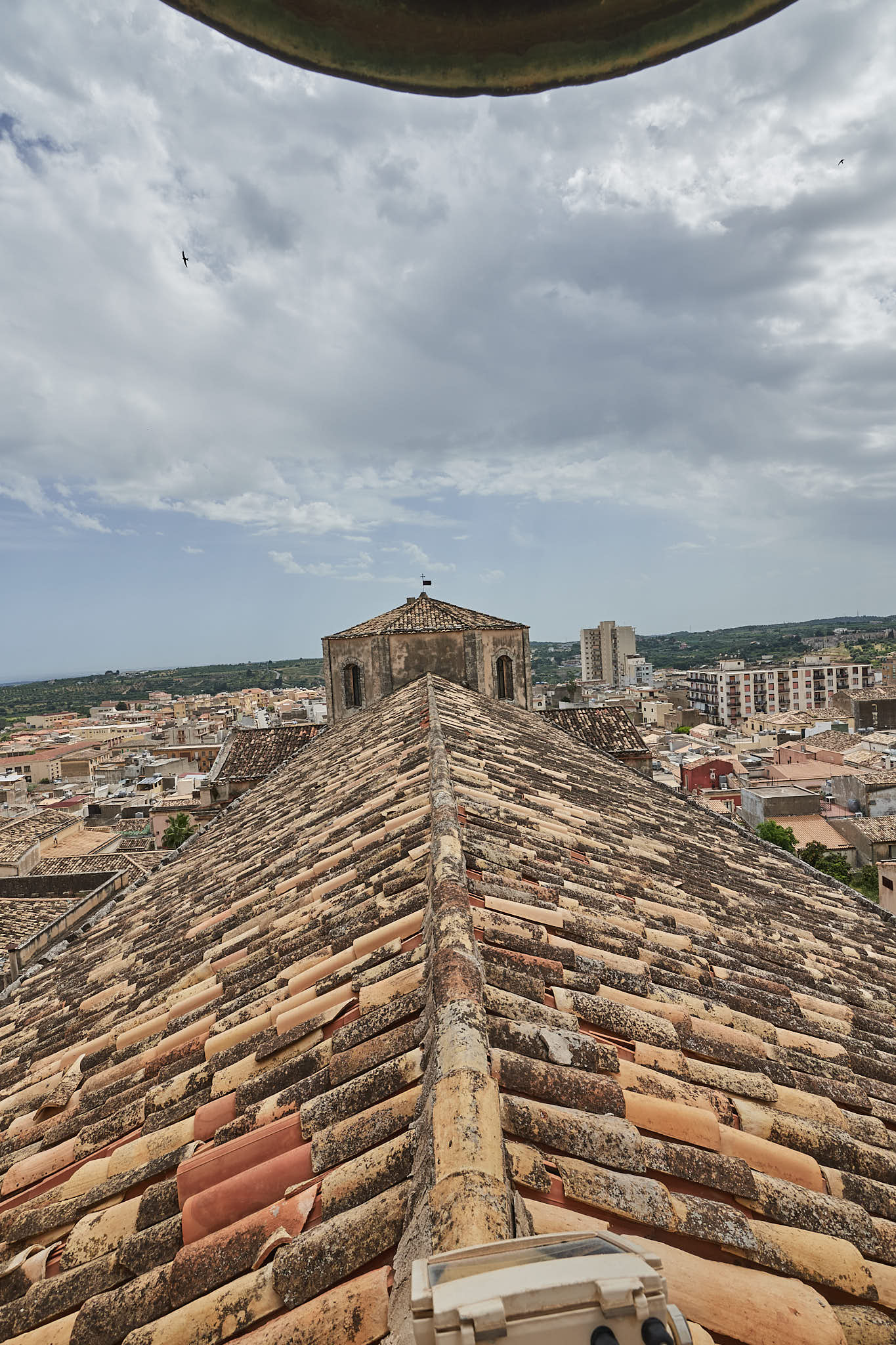 I had read that this view was the best in all of Noto and it was even better than advertised. The baroque limestone buildings of the centre with beautiful blue skies with pretty clouds overhead made it an ideal day to be on that Church roof. We took in the view all around and took more photos than we needed to including some with the bells from the old church. We also put the mini tripod to use to take photos of both of us since we were the only ones up on that roof.