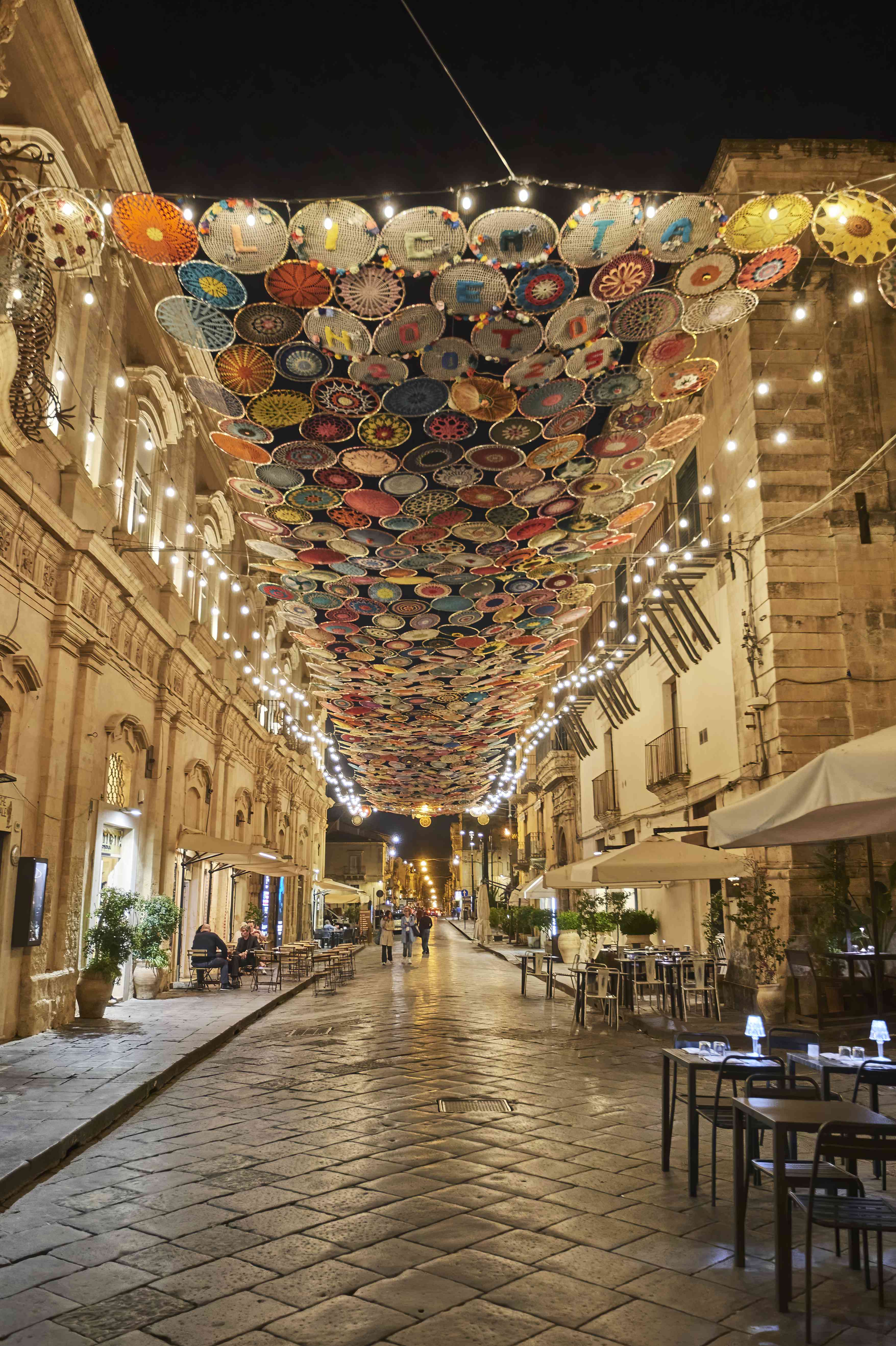 The canopy made of embroidered rings decorating the Main Street in Noto