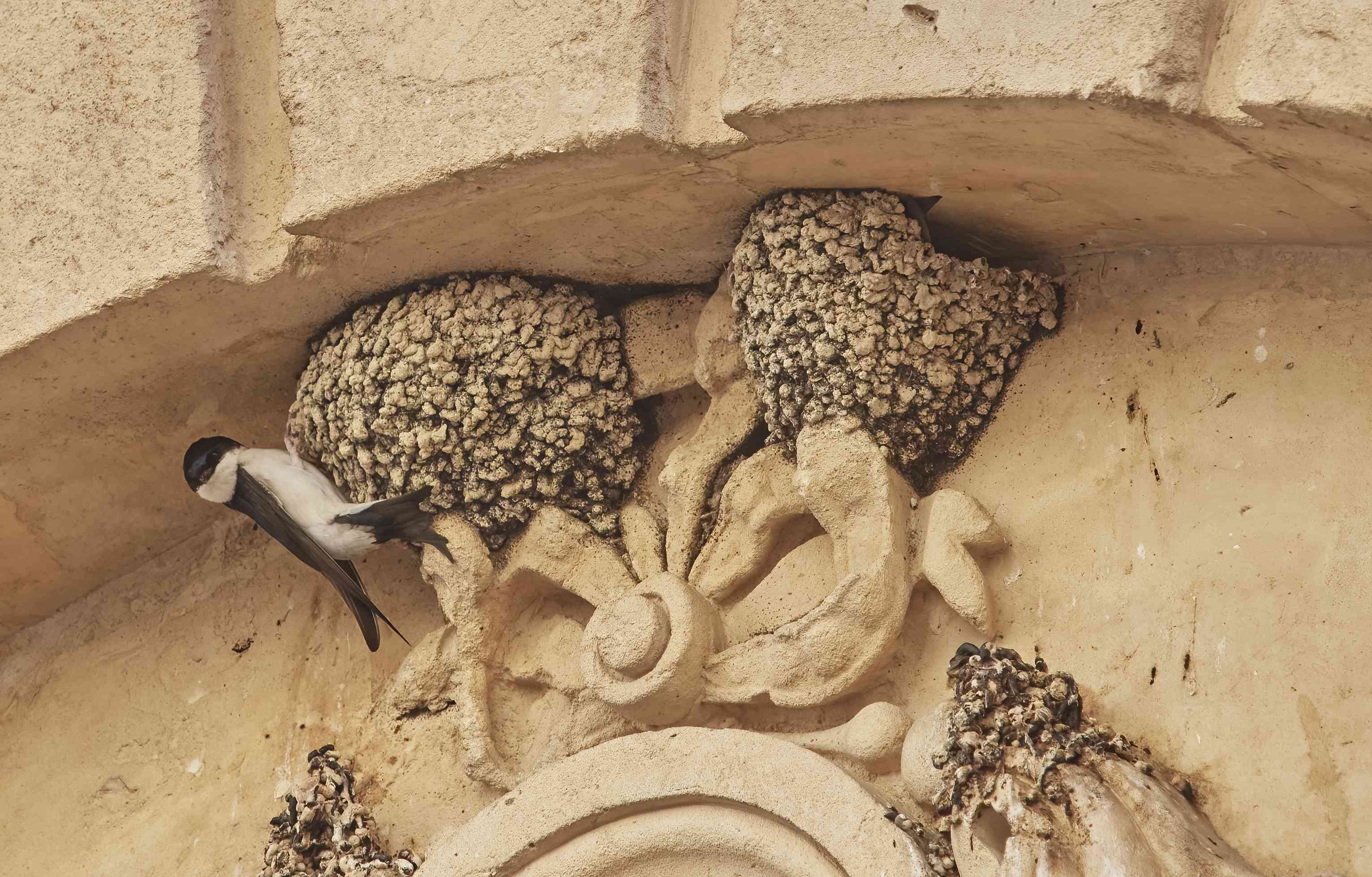 Swallows make the carved limestone buildings a scaffold for building their mud nests