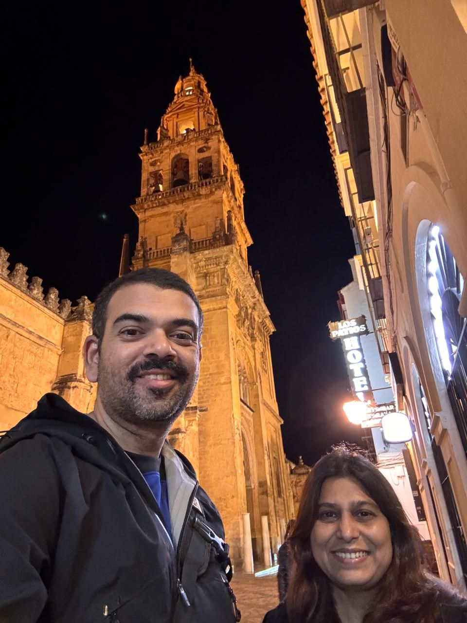 We woke up as it was turning dark and the Mezquita was all lit up and there were pretty clouds in the sky. The SLR came out for the first time as I had not felt like taking it out in Malaga, but this beautiful view from the room got the tiredness of the long flight out and we were ready to have dinner and take a short walk around the Cathedral.