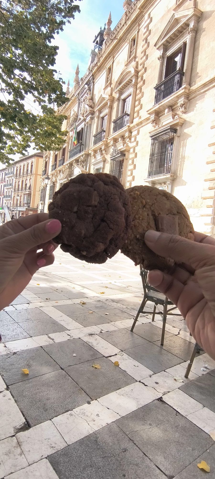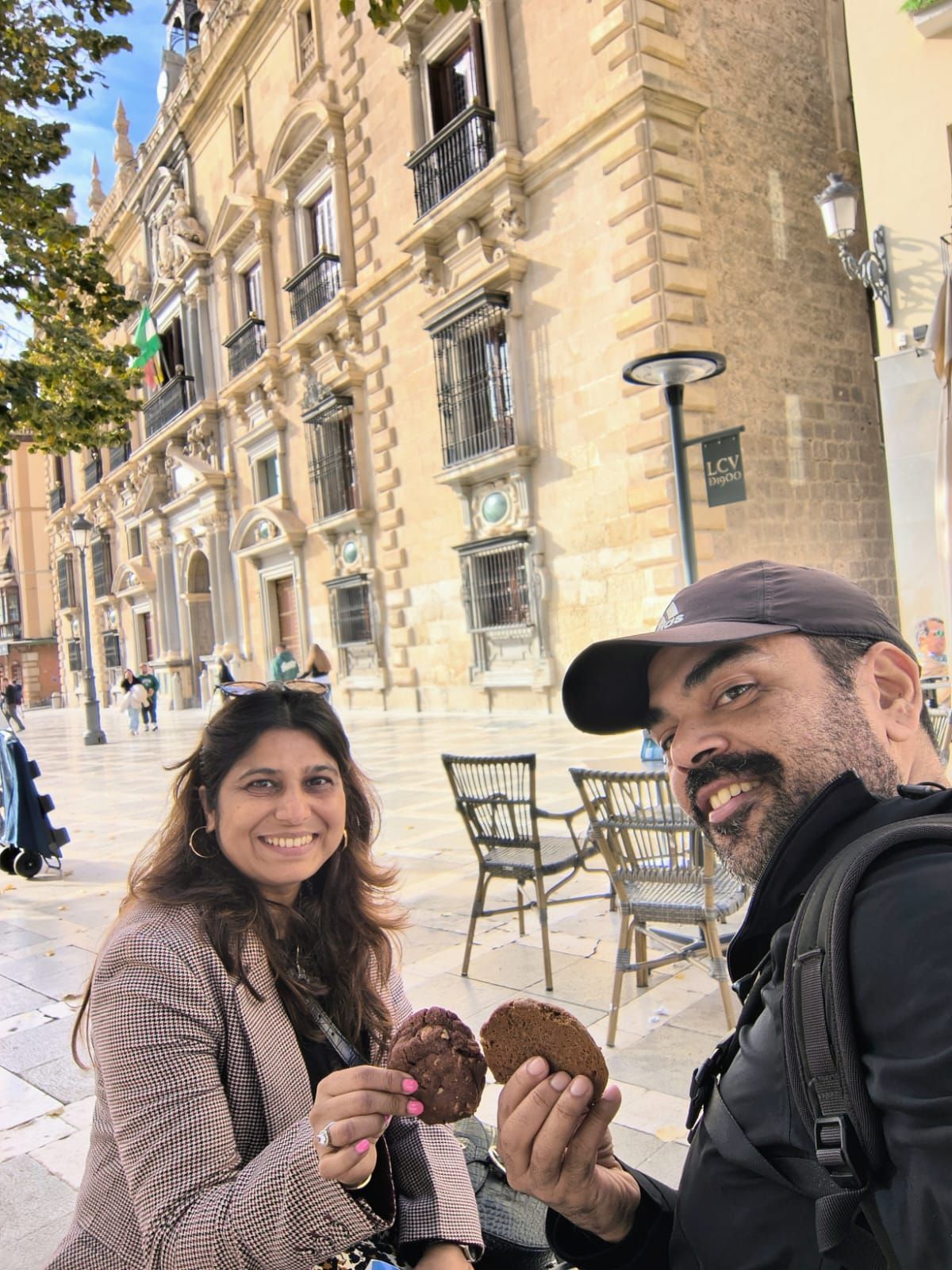 Enjoying our cookies at the Plaza Nueva