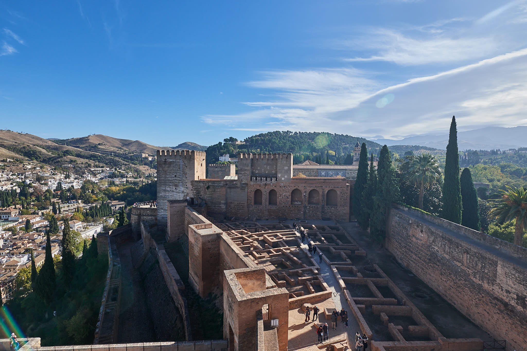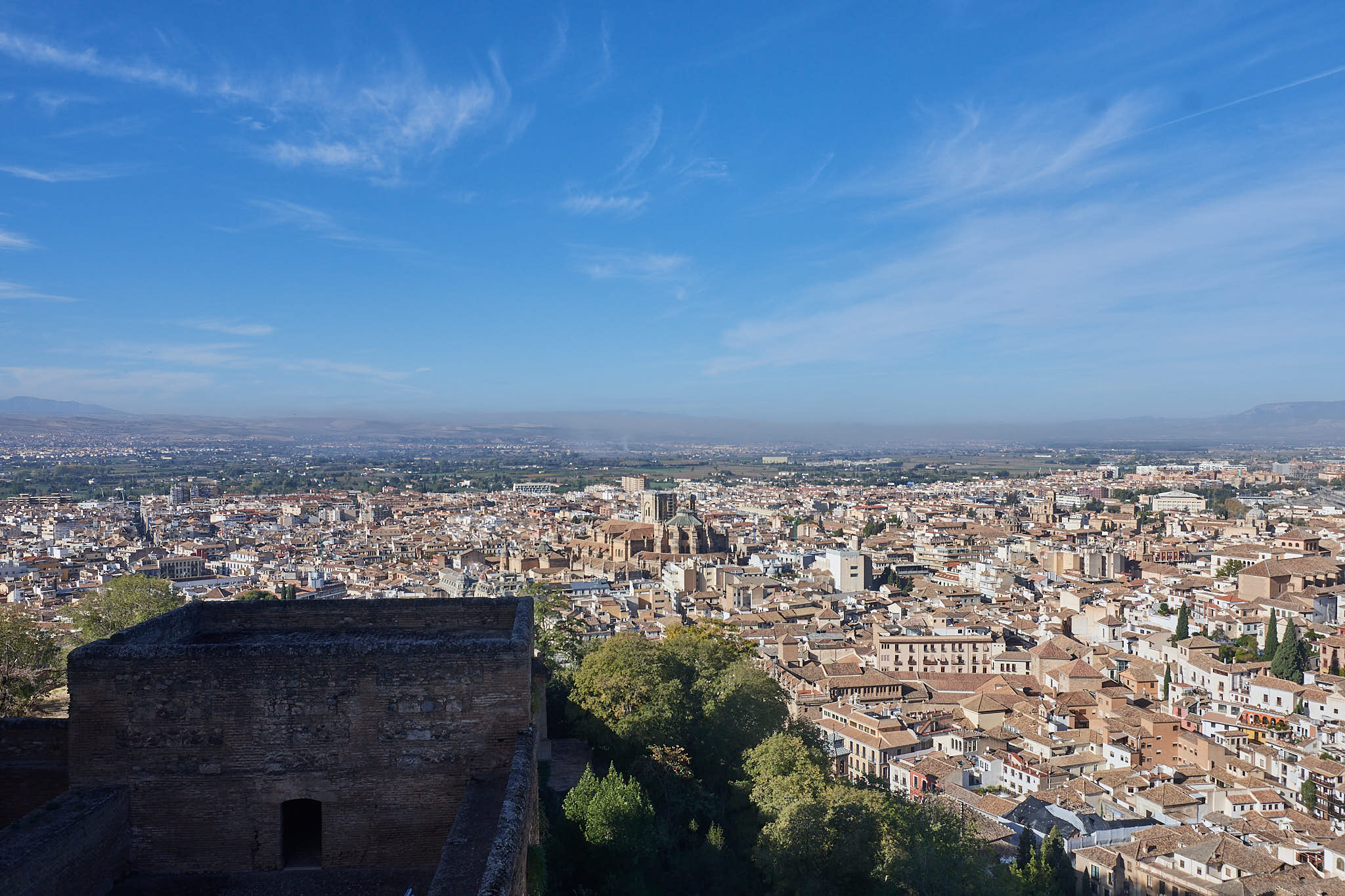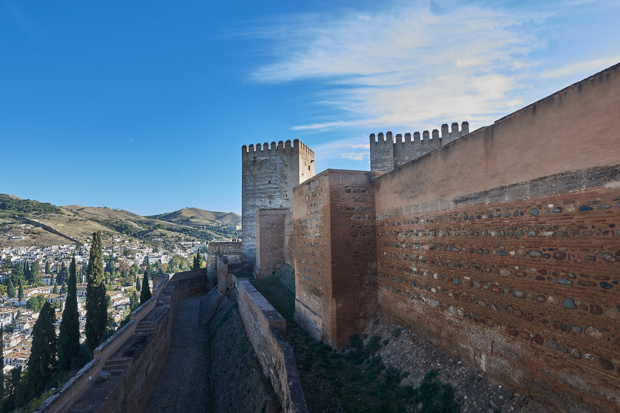The thick walls of the Alcazaba and Granada down below