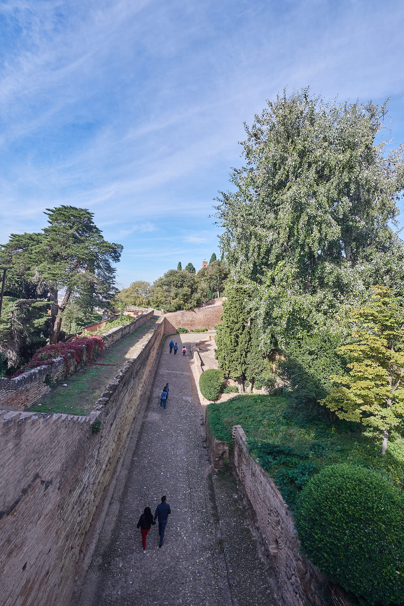 The tall conifer lined avenue leading from the Generalife to the rest of the Alhambra complex