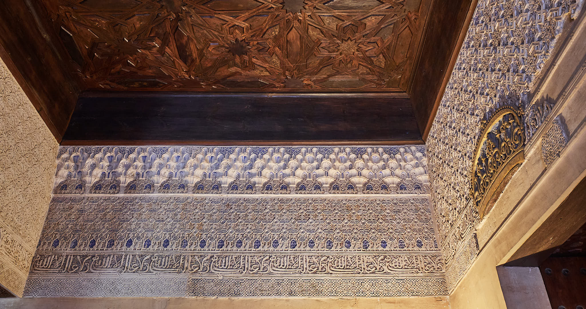 Wooden ceilings and painted ceramic tiles in the Nasrid Palaces