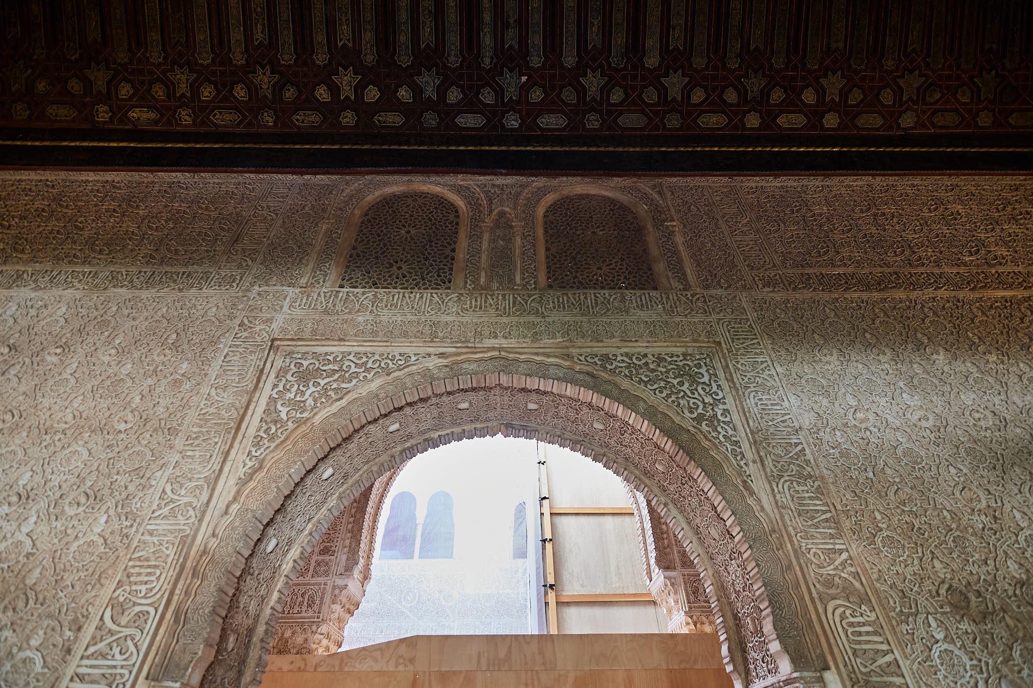 Carved wooden ceilings decorated with stars and arabic script
