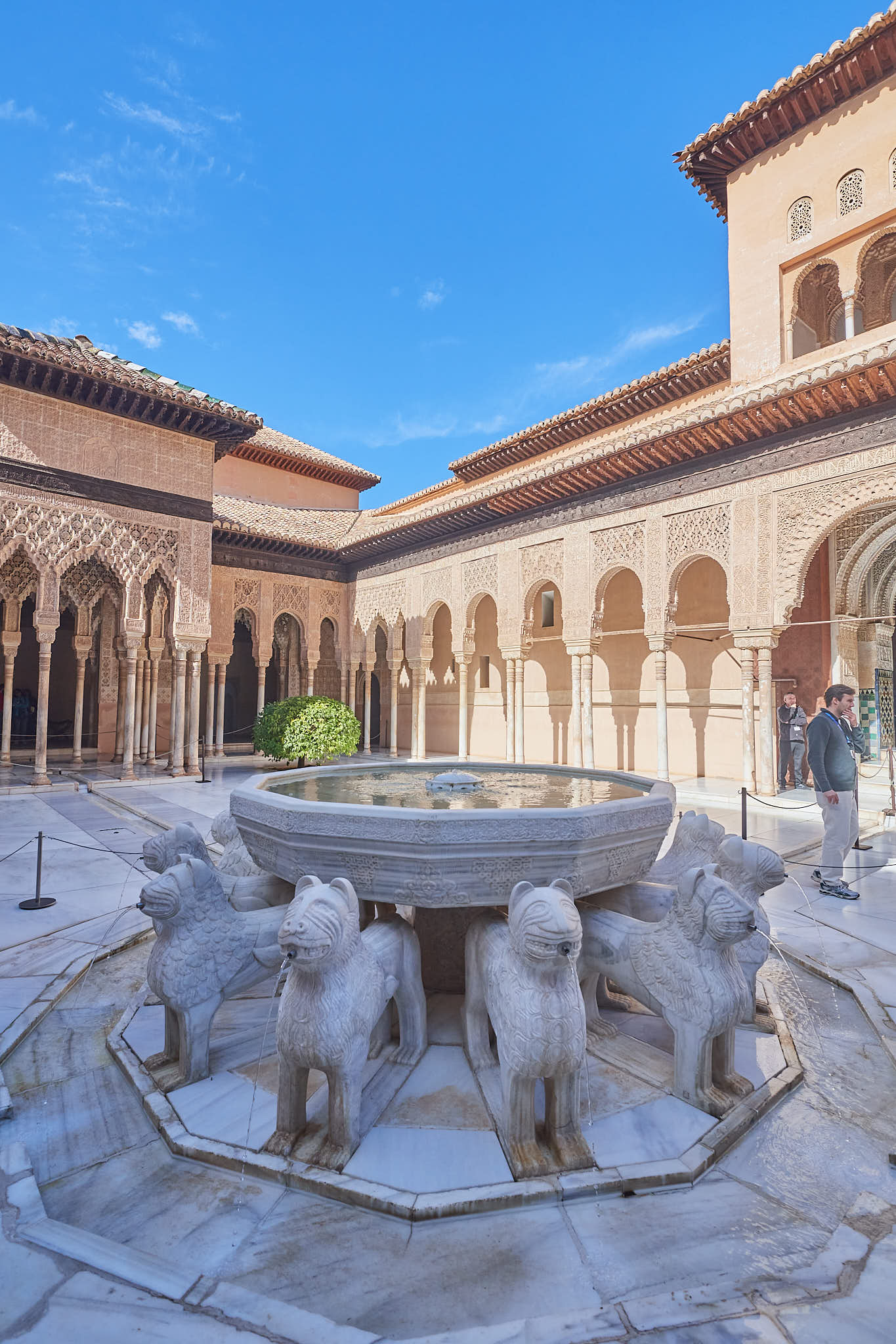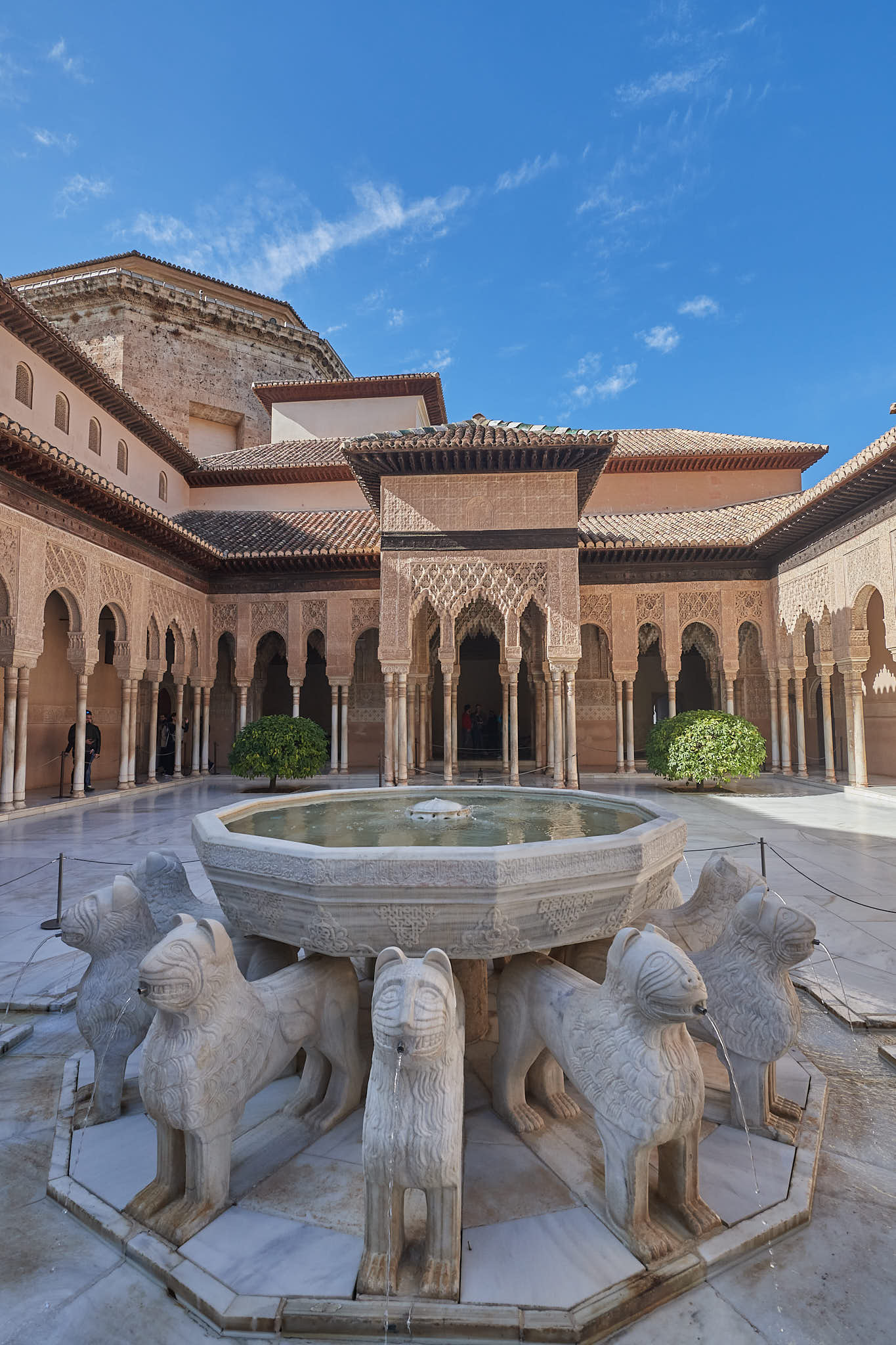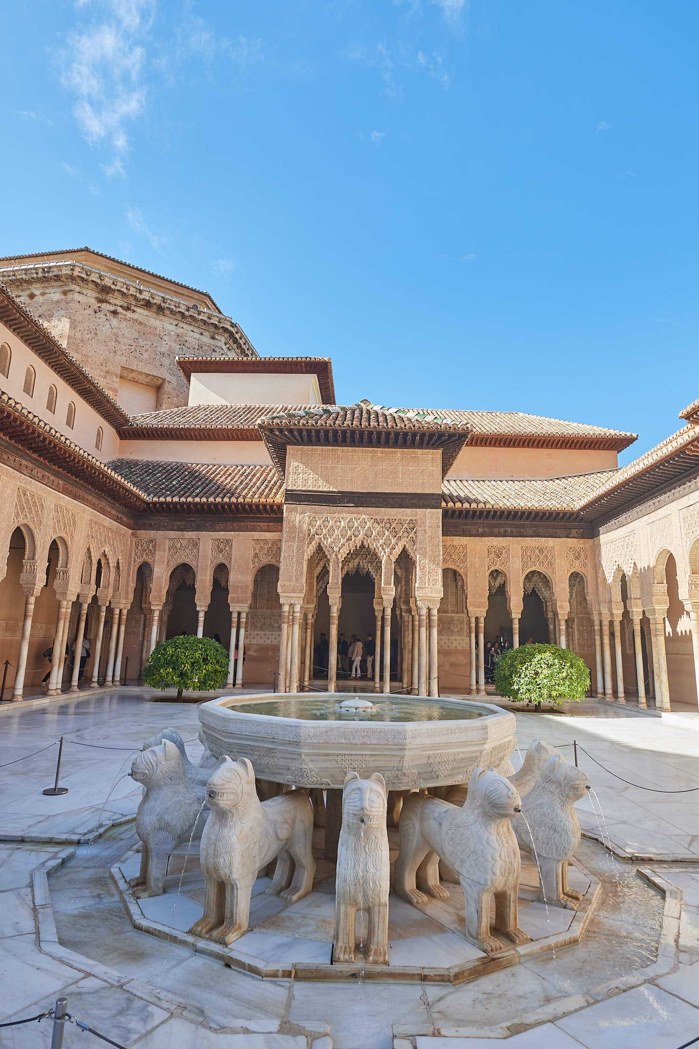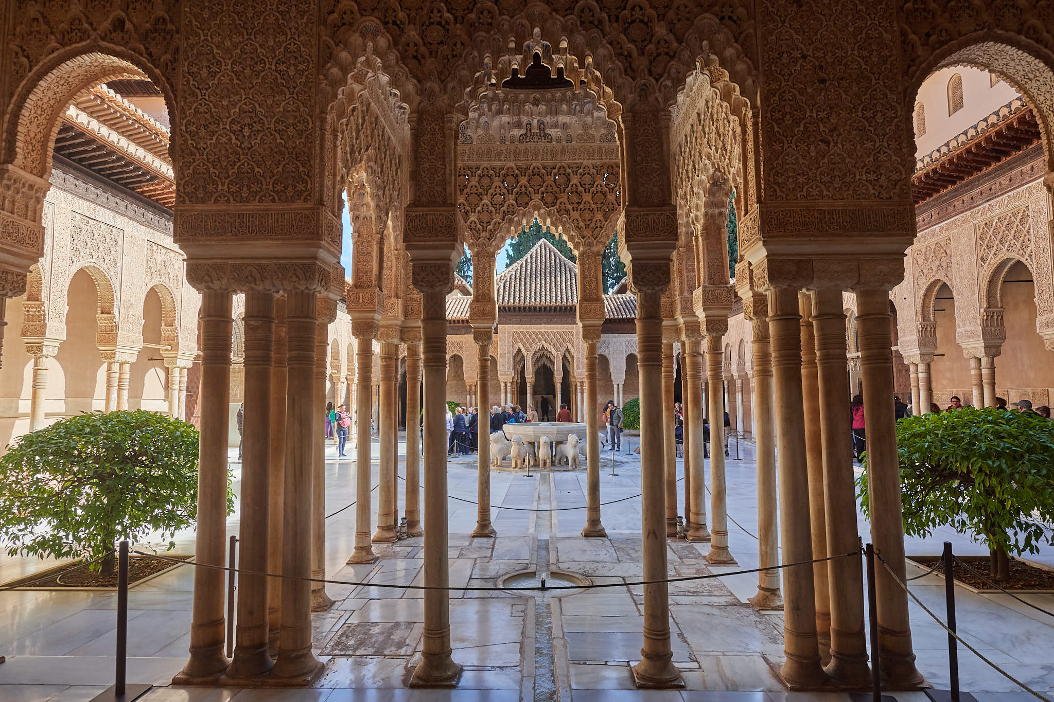 The courtyard of lions surrounded by thin pillars and delicately carved arches above
