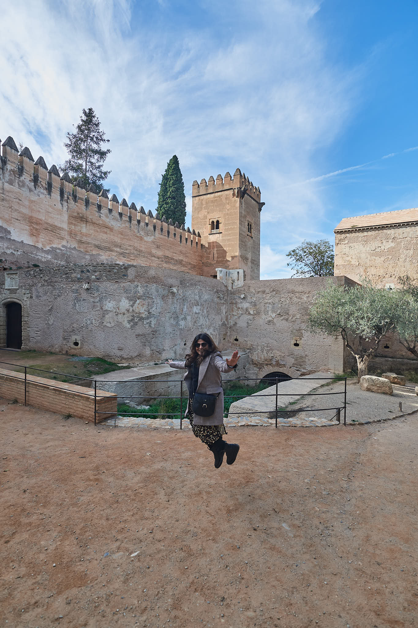 The better half does her patented jump with the walls of the Alcazaba behind