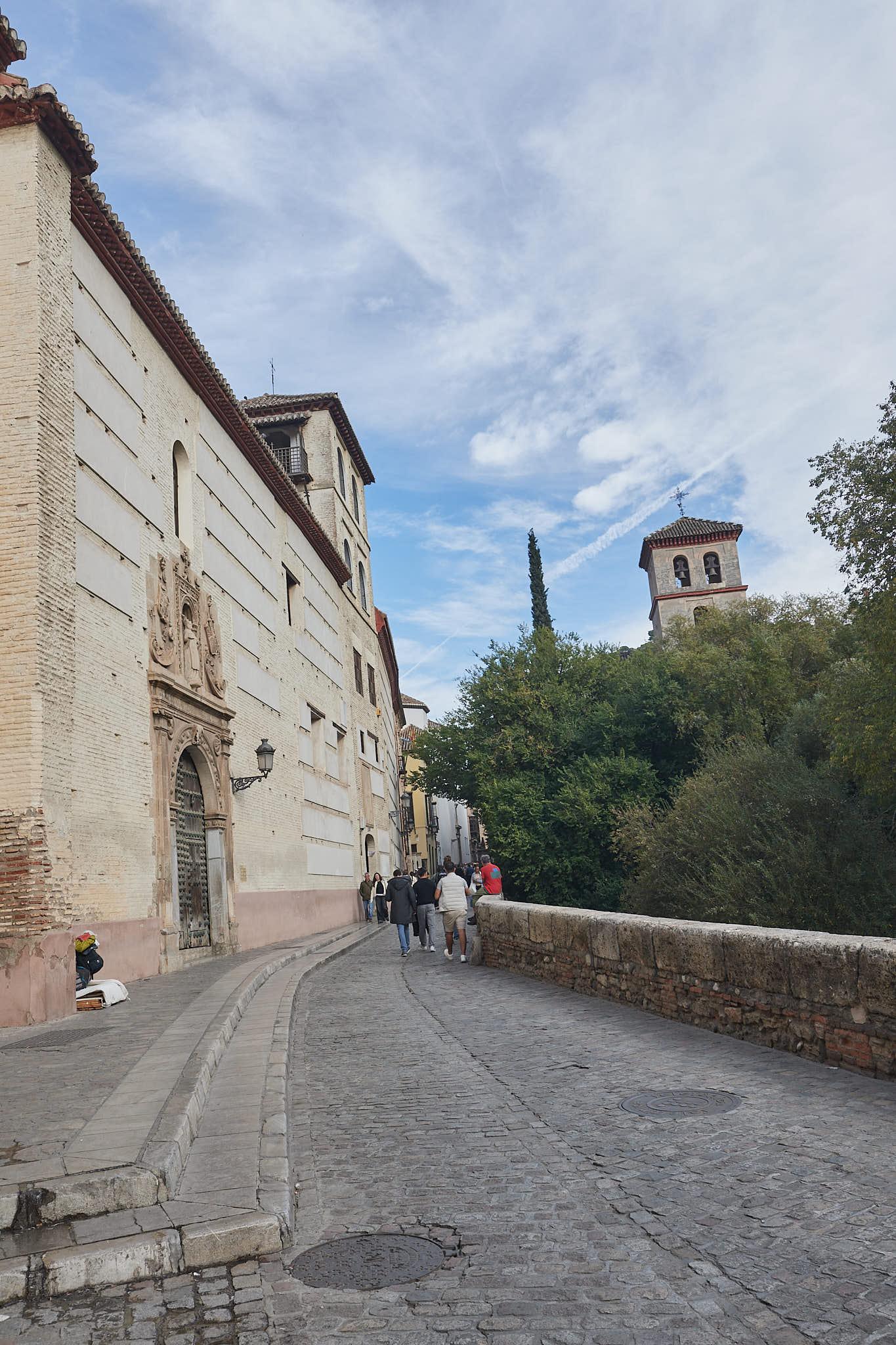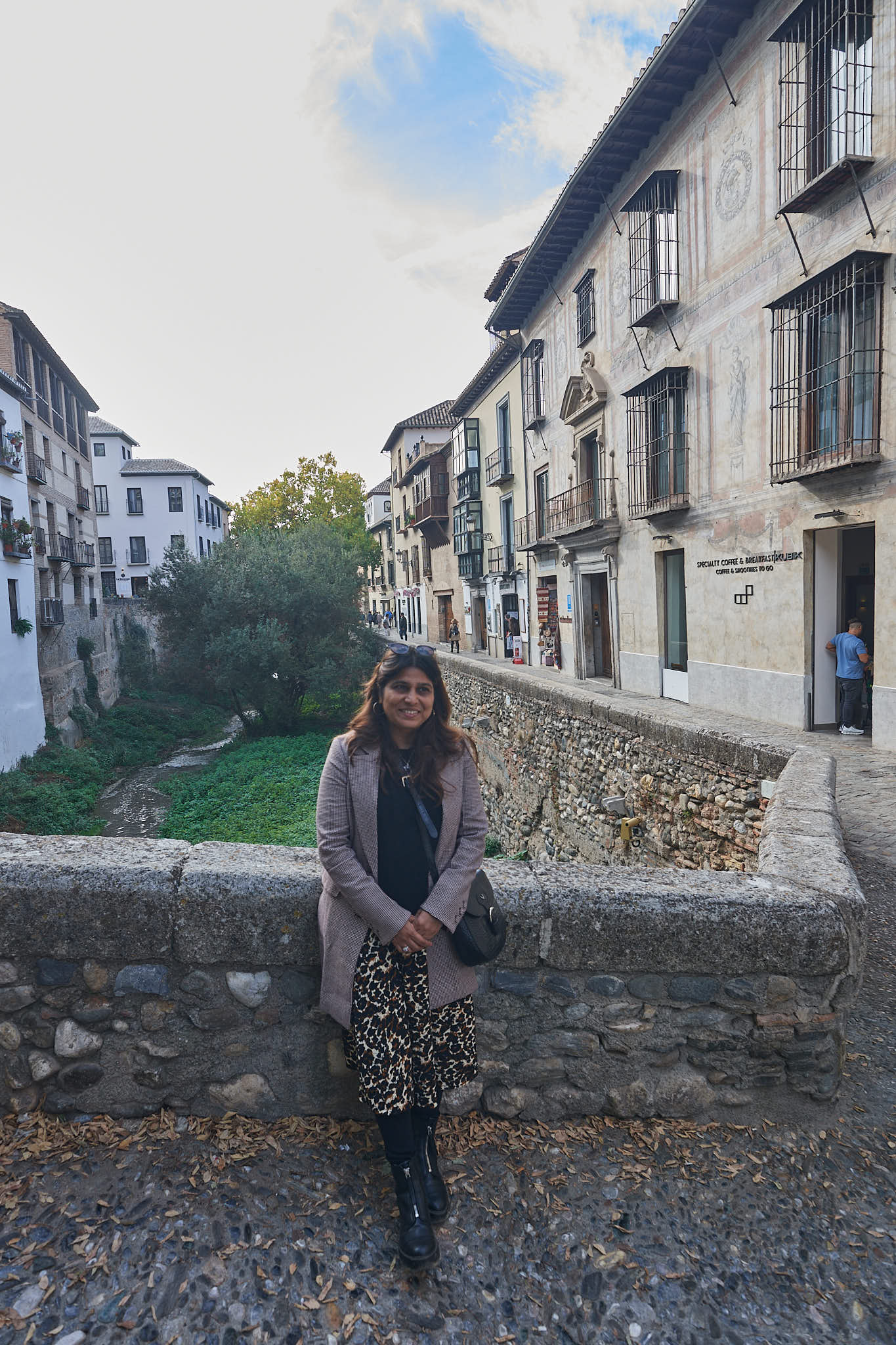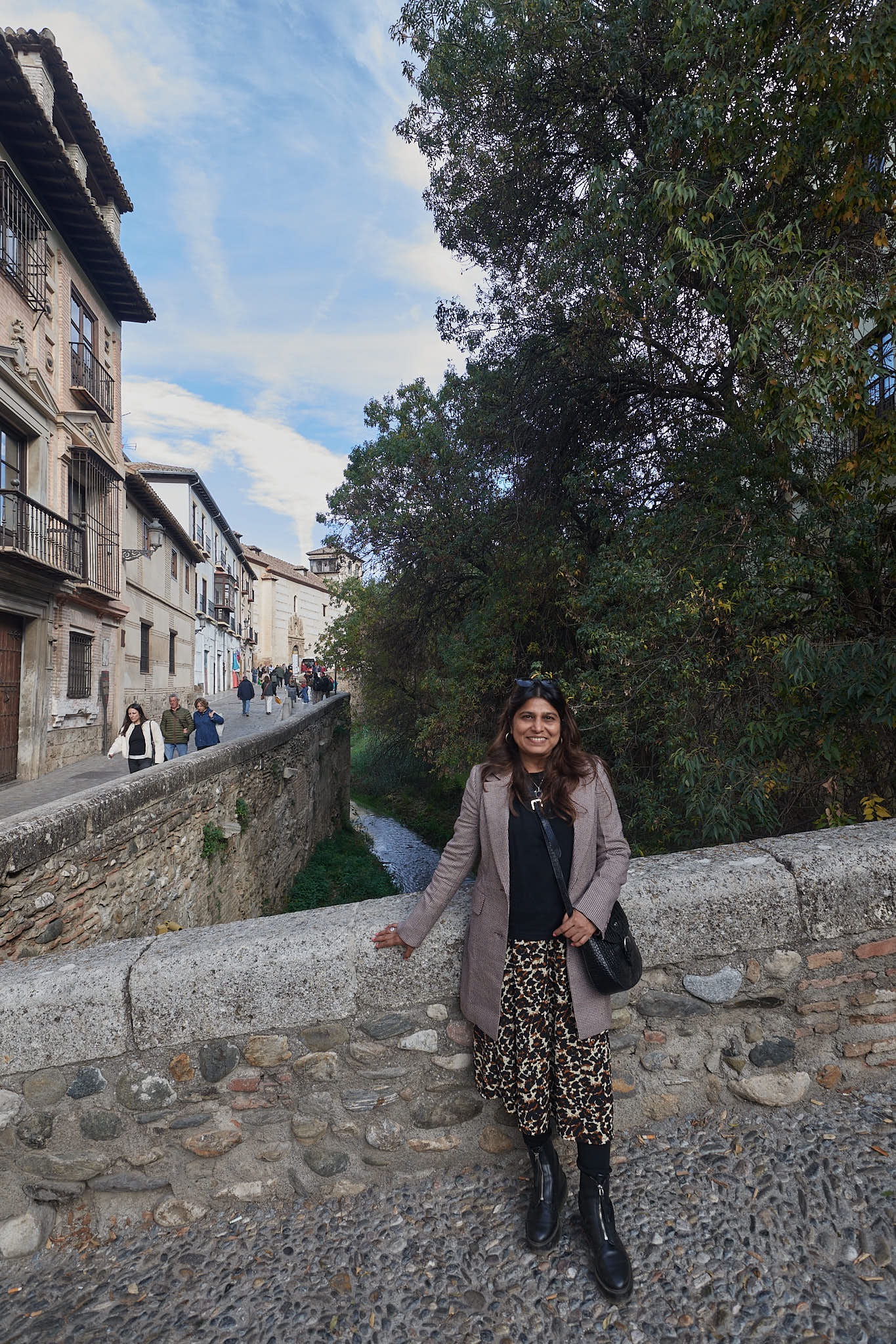We then reached a street at the base of the Sacromonte neighbourhood and started our walk back to the hotel. The street then opened out parallel to the little Darro river and we had a nice walk by the river – funnily this street is called the Paseo de los Tristes or Walk of the sad ones as this was the route taken by funeral processions in the olden days to the cemetery at the edge of the town. We certainly weren’t sad that day, we happily walked down to a bridge across the tiny stream of a river for some photos before we resumed our walk back to Plaza Nueva.