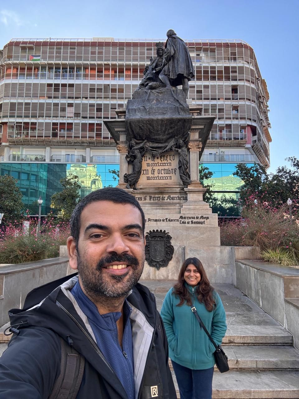 Taking a selfie with the Queen and Columbus at Plaza Isabel Catolica