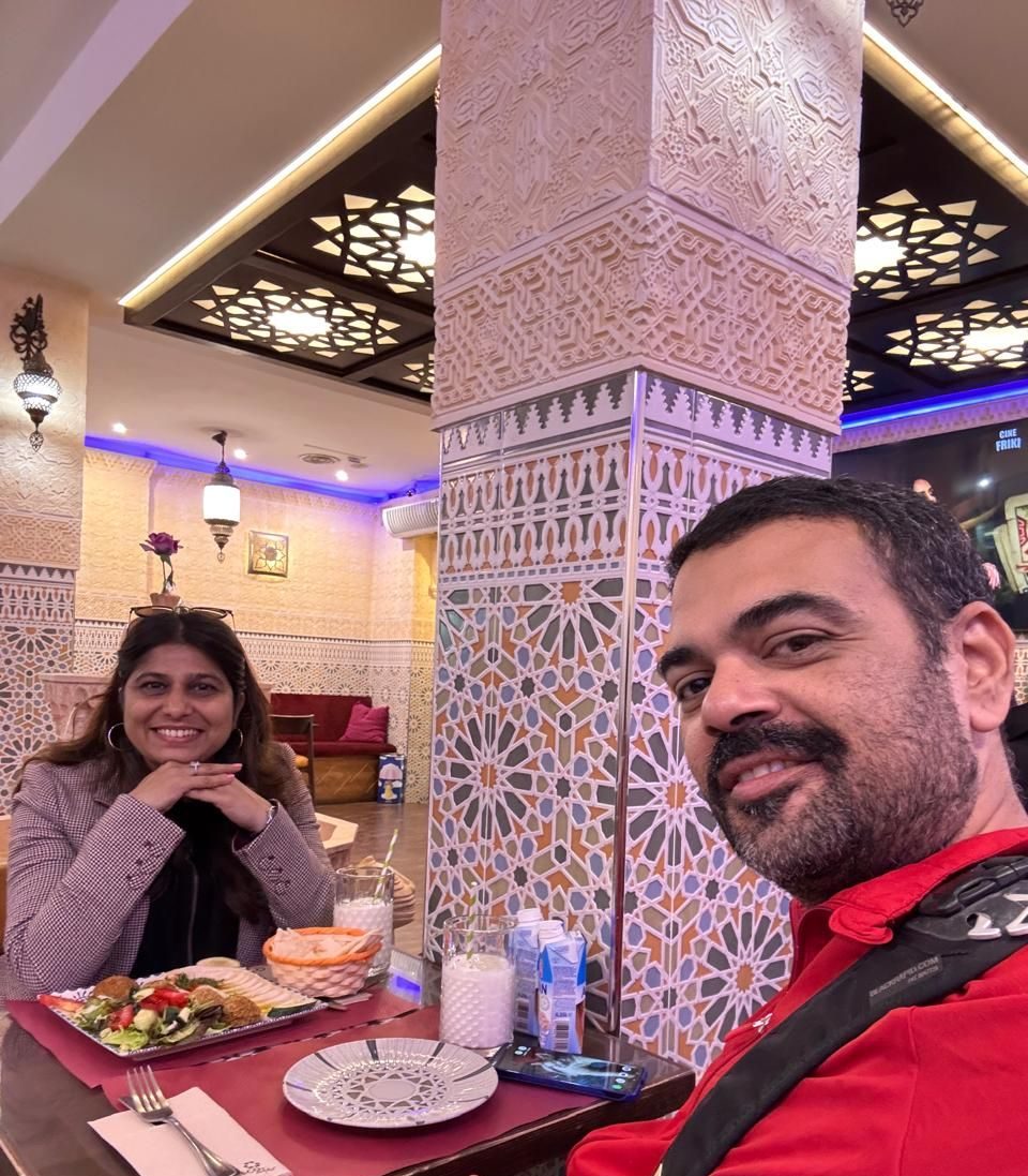 Happy us after a delicious Syrian lunch in Granada