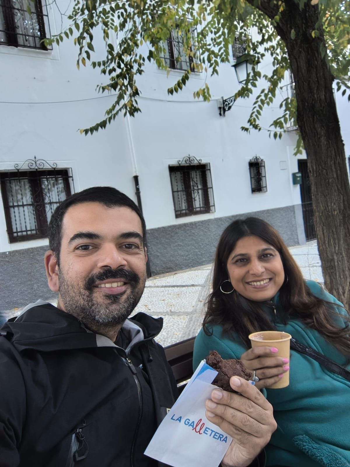 Enjoying a hot chocolate and Cookie from the La Galletera in Granada