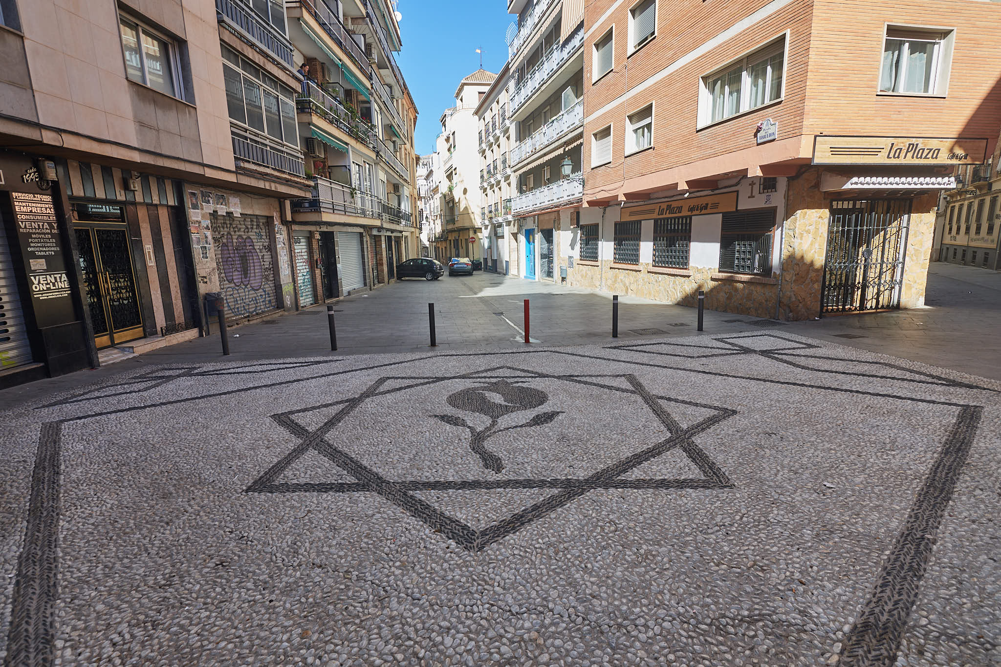 The cobblestoned streets with the pomegranate symbol of Granada