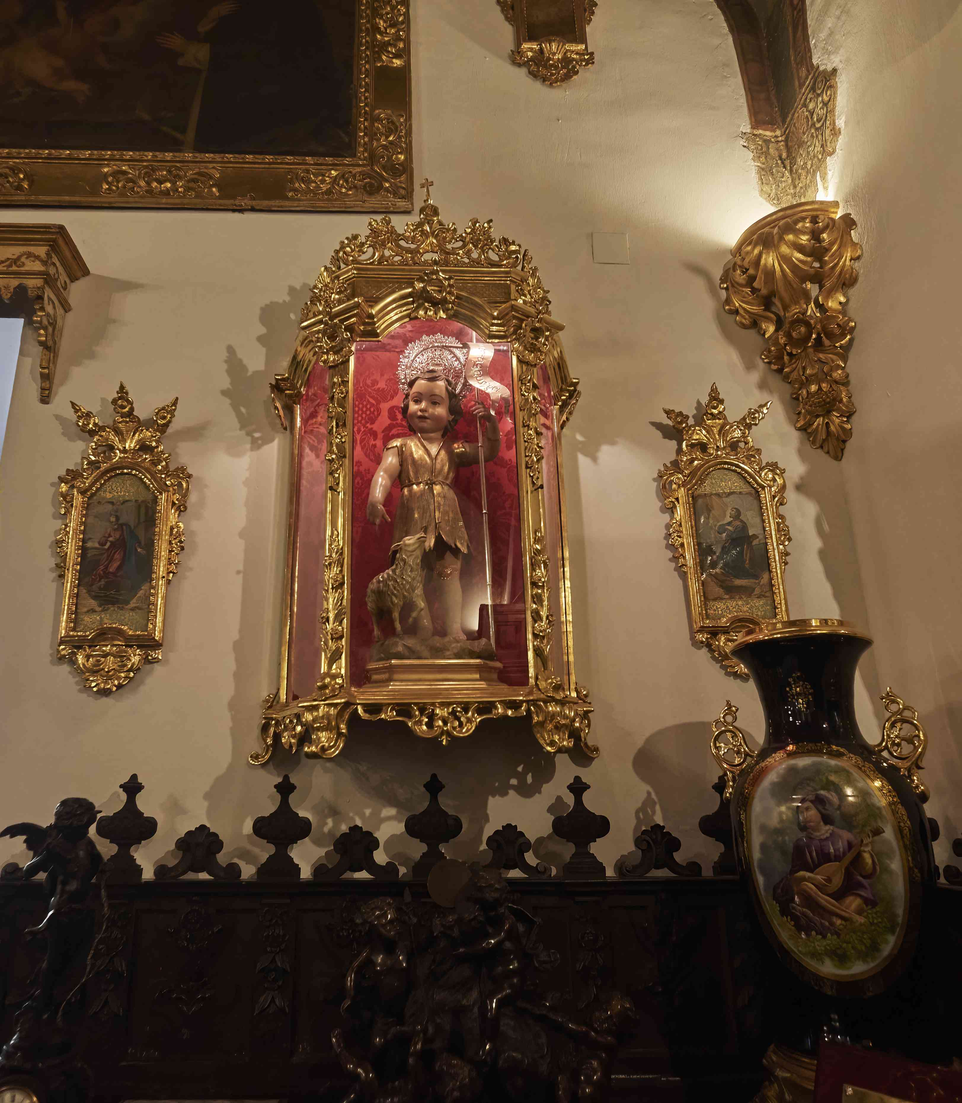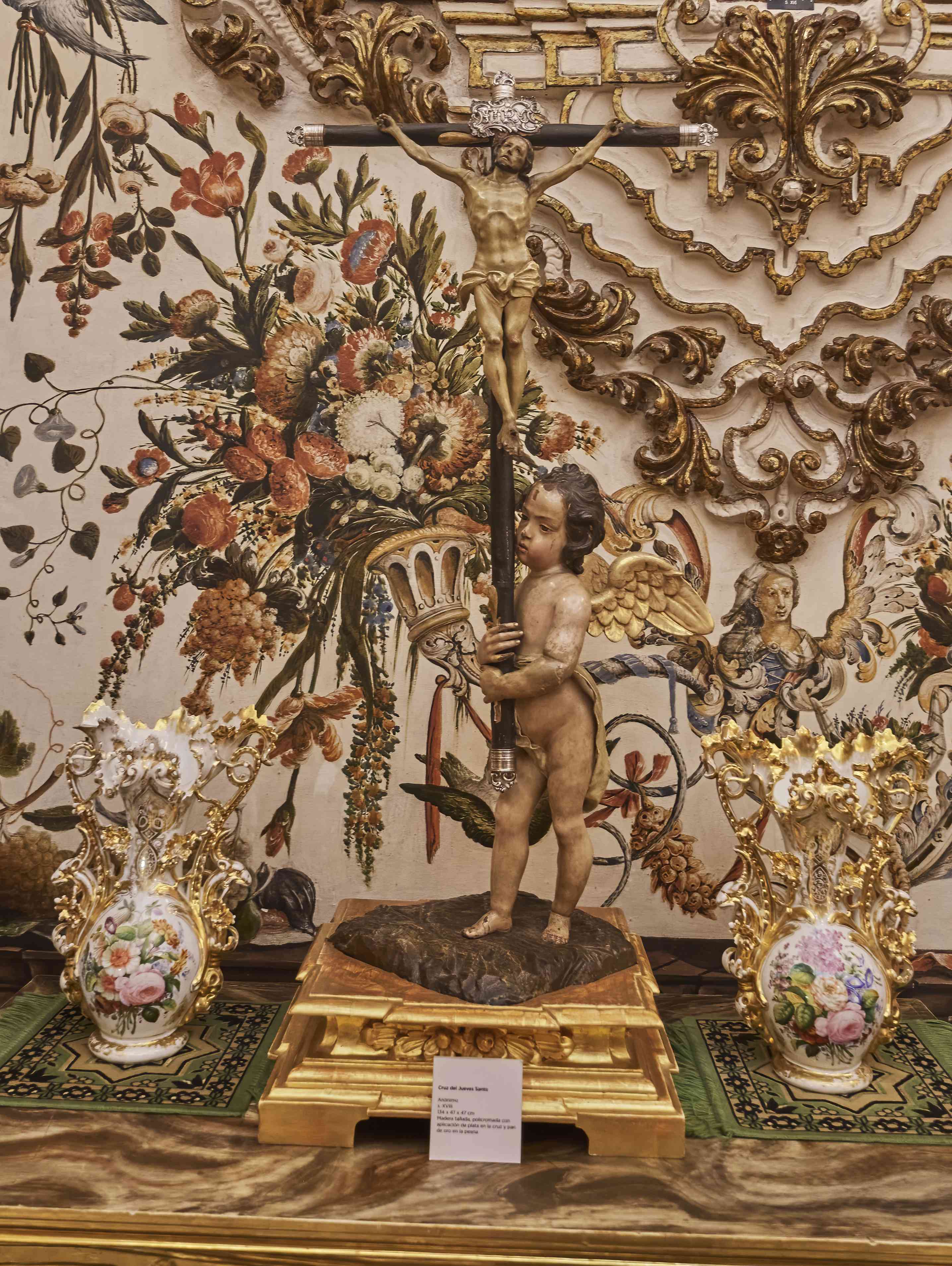 A delicately carved child carrying a crucifix drew my attention