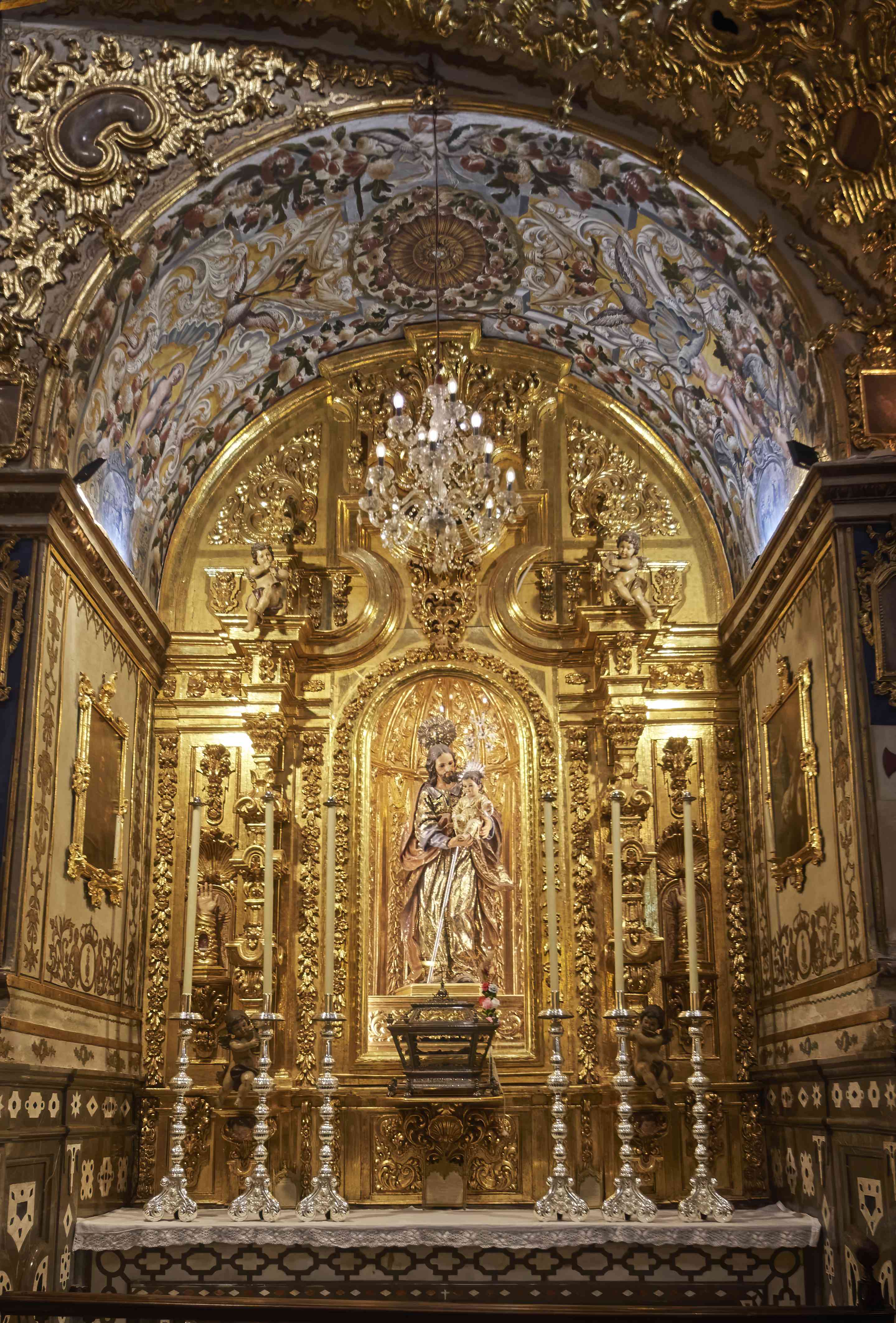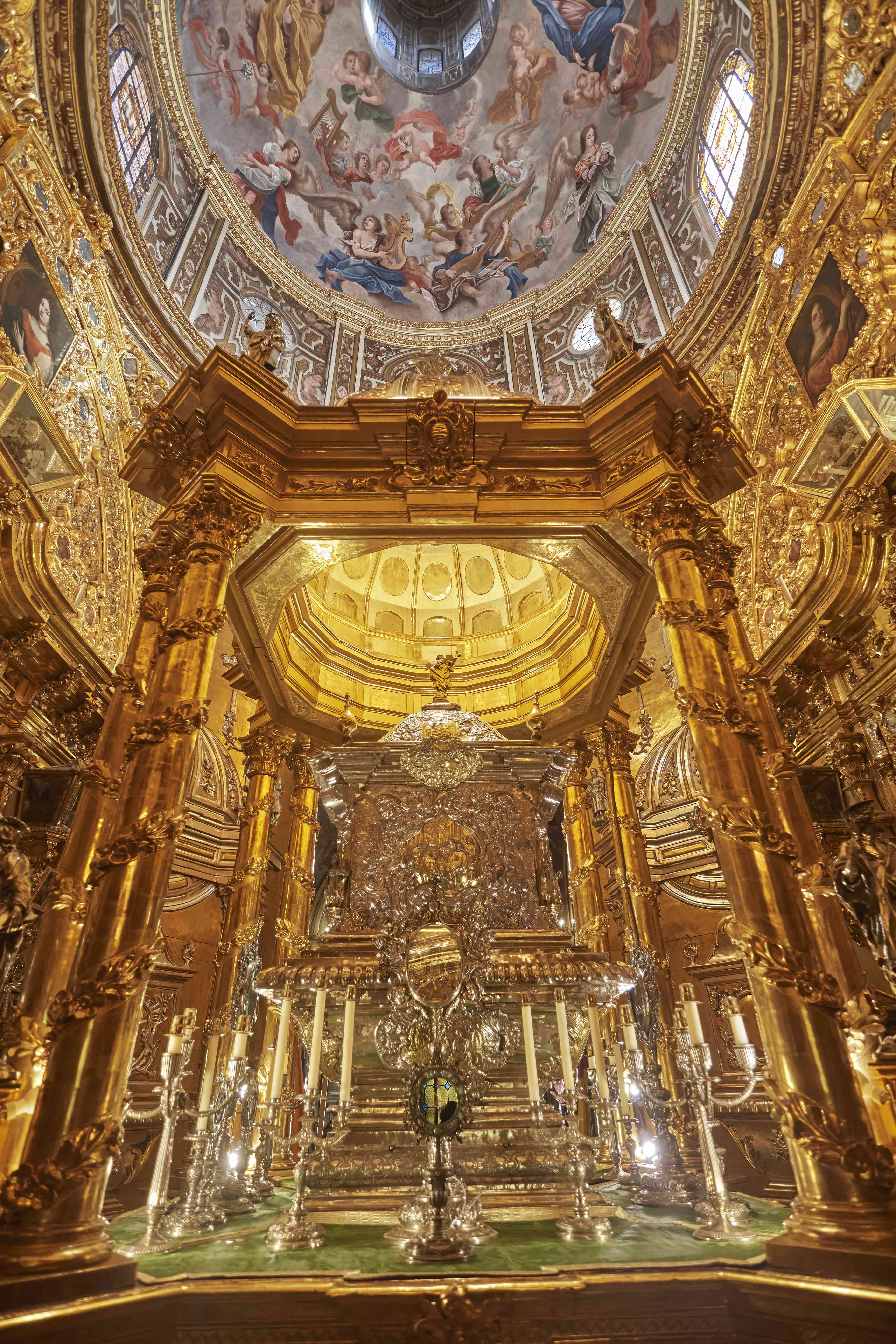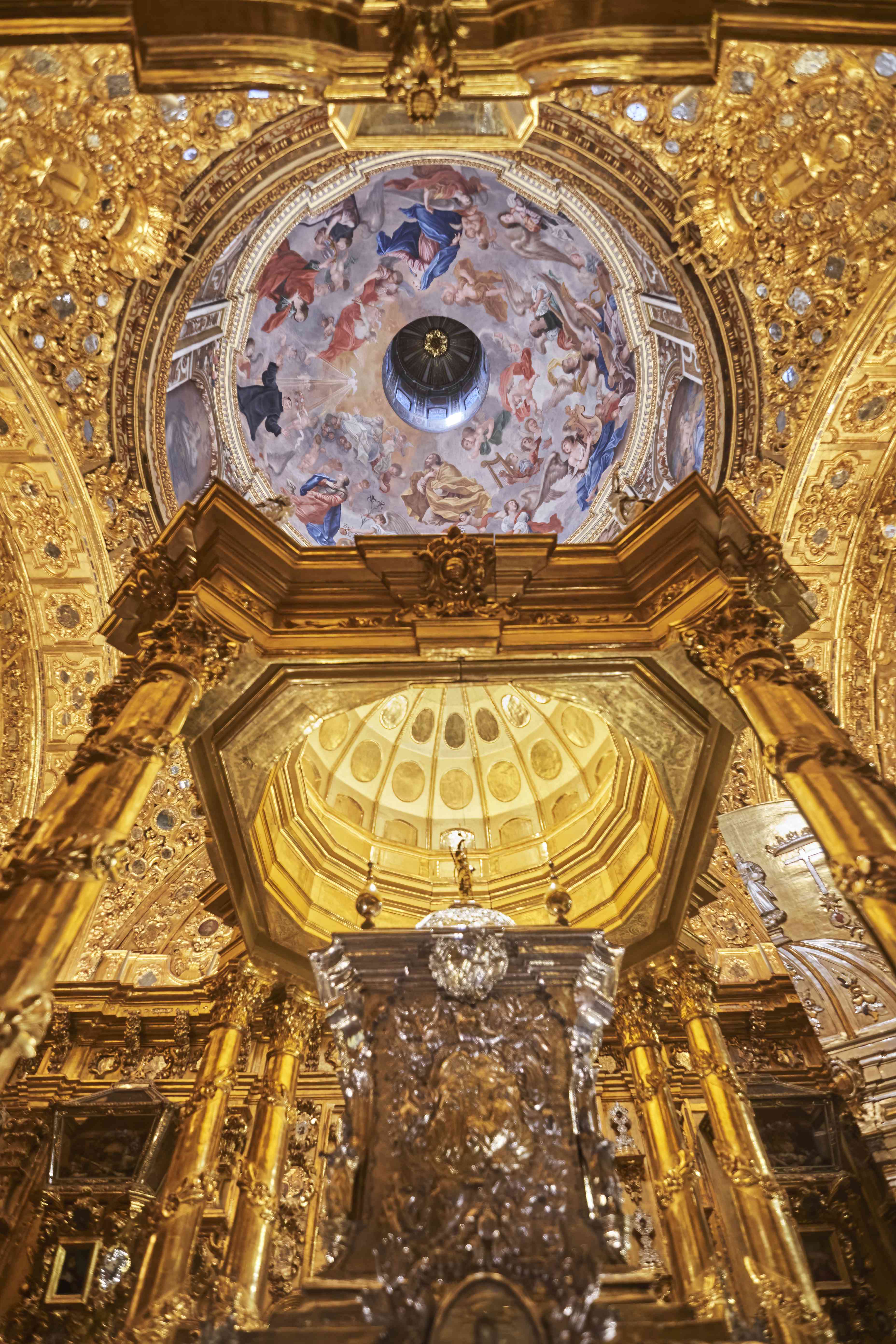 We then entered the Basilica itself and it was just full of art! I am not a religious person at all, but seeing all the art in the setting which it was meant for makes me enjoy it a lot more than the sterile museum atmosphere. Here the painted vaulted ceilings by Sanchez Sarabia and the gilded Altarpiece by Guerrero and Sarabia which holds relics of St John are the main attraction. I started clicking away to glory and I am posting a few here which hopefully capture the beauty of the Basilica.
