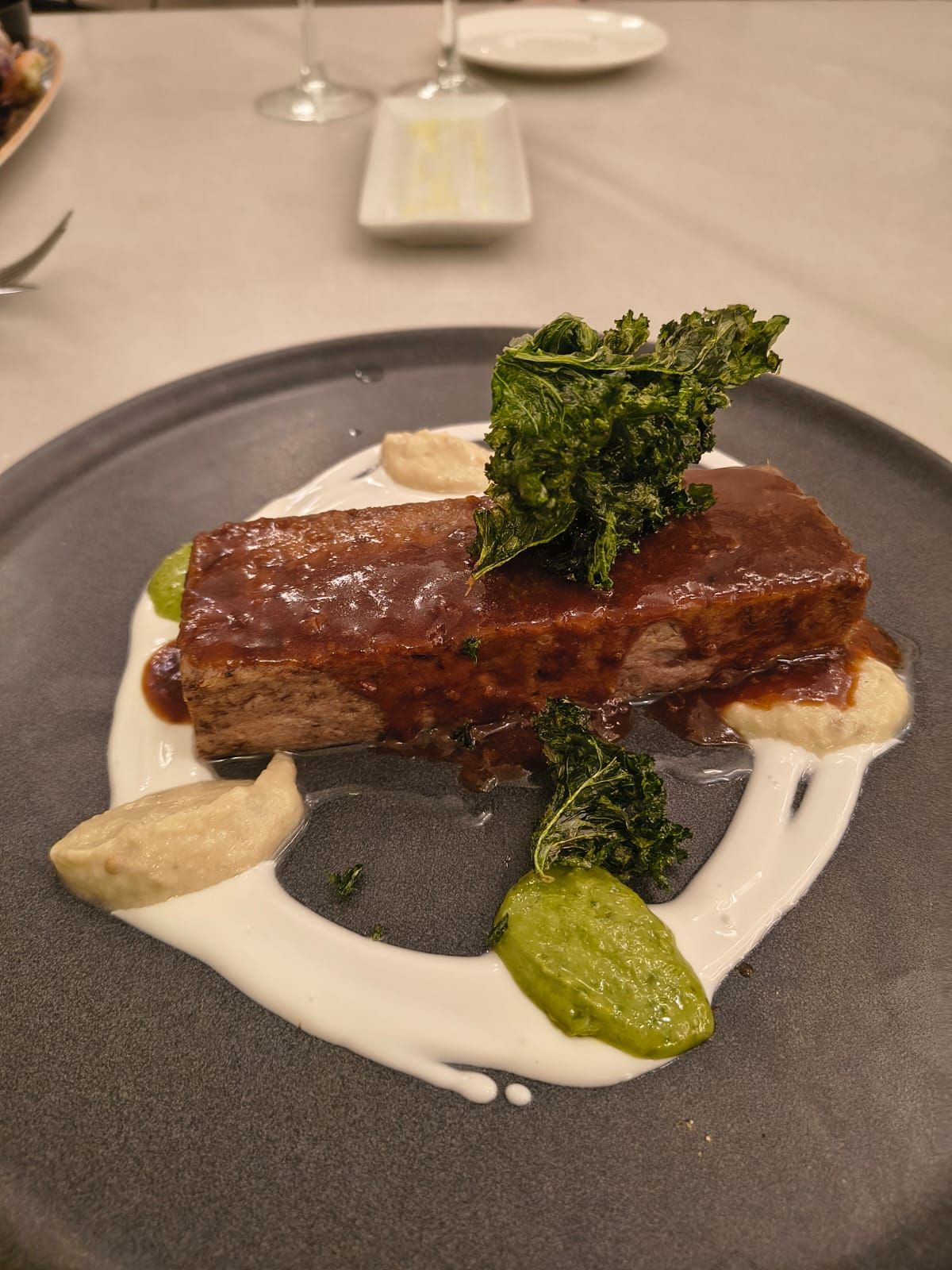 My delicious Lamb Terrine with yogurt, Pistachio pesto, hummus and pepper sauce