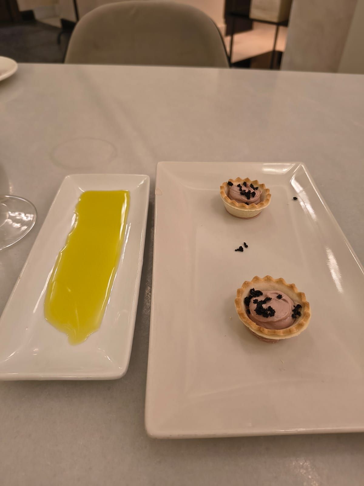 The famous Extra virgin Olive oil of the region at some canapés as complimentary Tapas