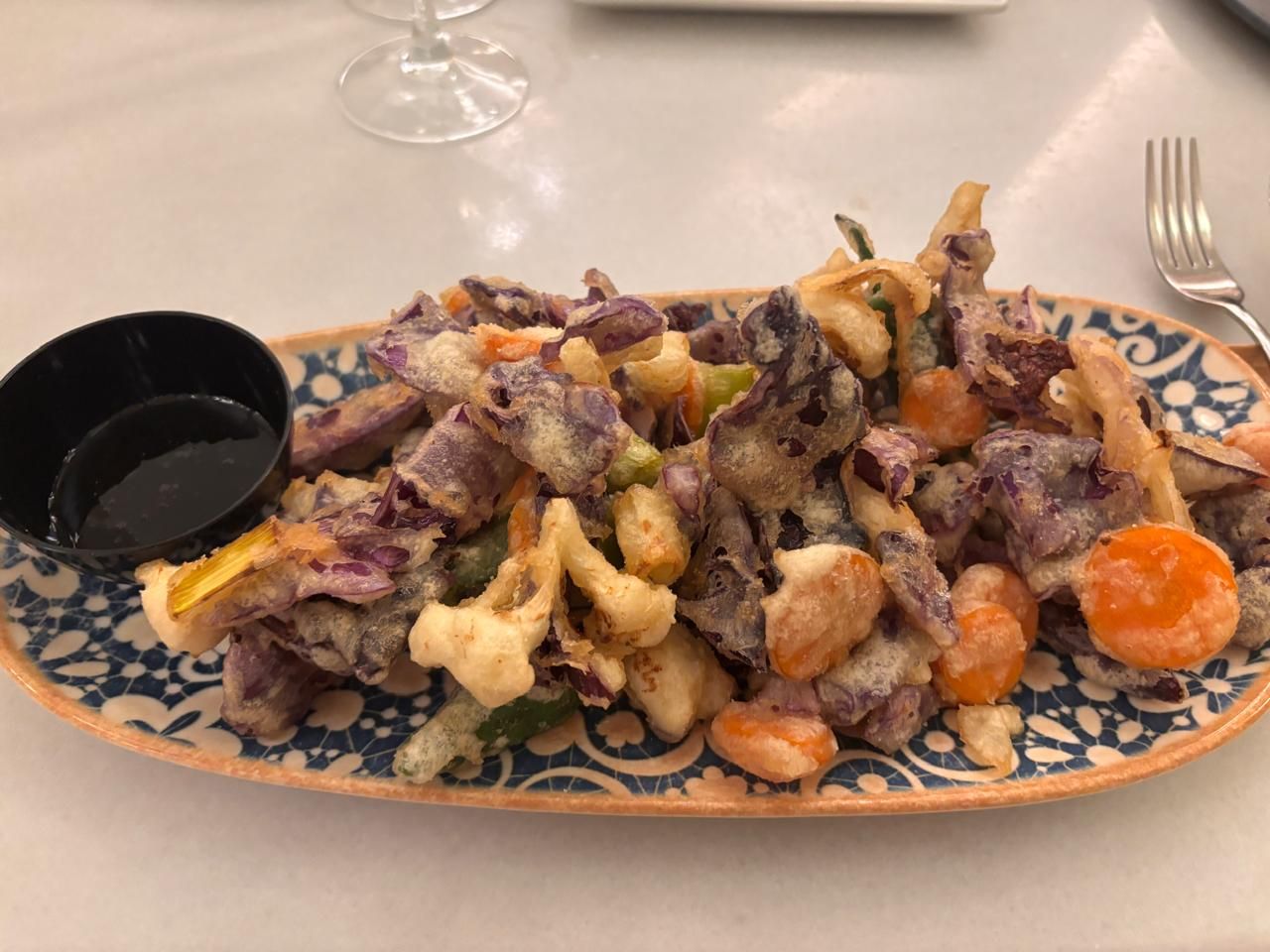 The better half’s huge plate of tempura de Verduras ( Veggie Fritters / Pakodas!)